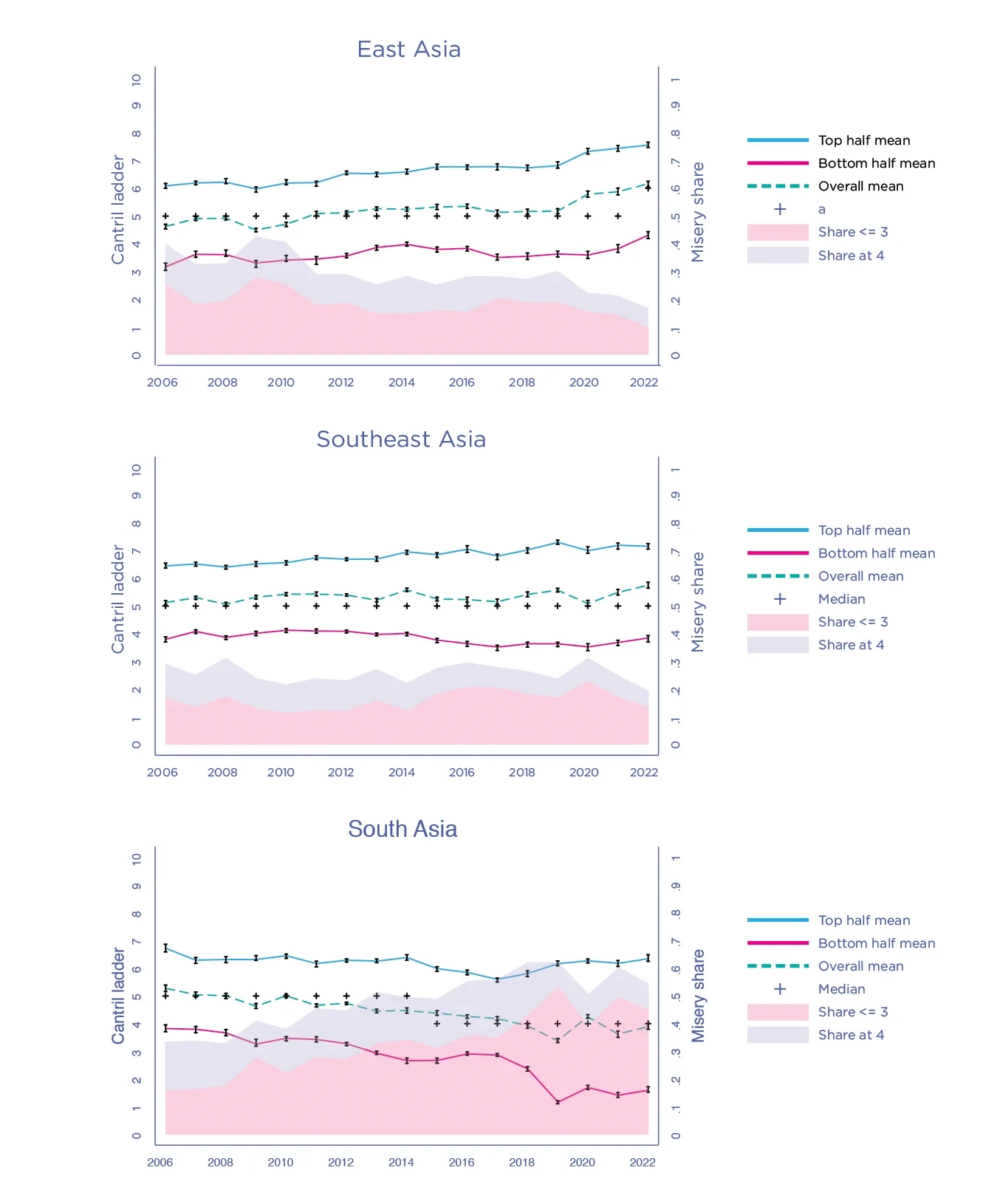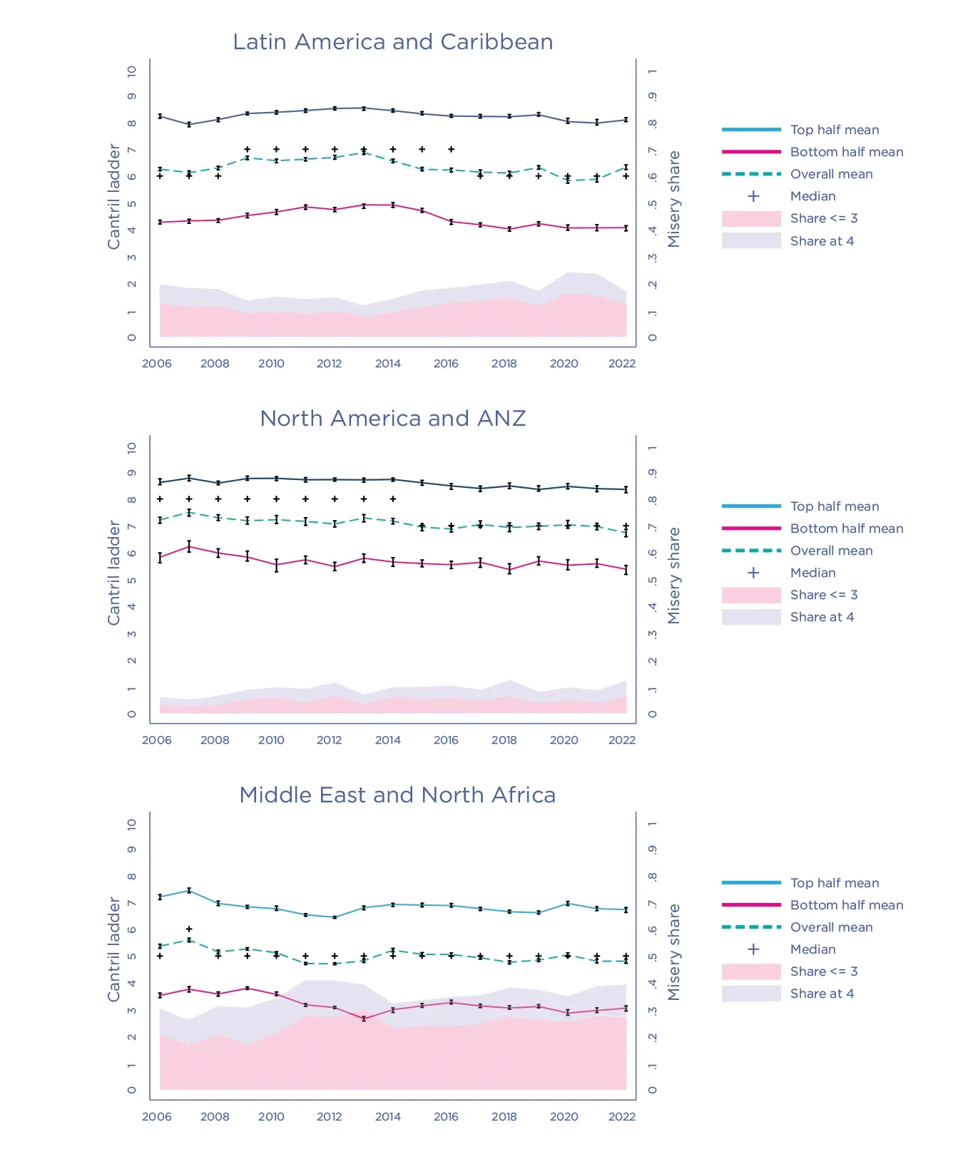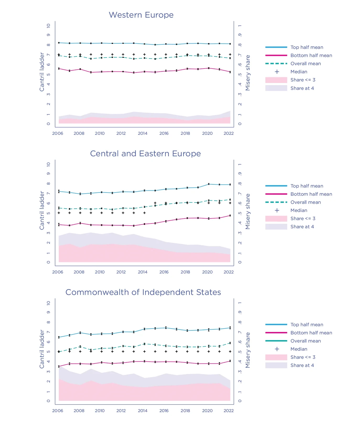 Figure 2.4 disaggregates Figure 2.3 Panel (a) by region to show, for each of ten global regions, the mean life evaluations of the happier 50% and the less happy 50%, and our two measures of misery. The first panels show continued convergence between Western and Eastern Europe, mainly comprising rising life evaluations and falling misery shares in Central and Eastern Europe, with the gaps between the top and bottom halves fairly constant, except for a recent widening of the gap in Western Europe. Among the Asian regions, misery shares have been falling in East Asia, fairly constant in South East Asia and growing in South Asia. Misery shares are lowest in Western Europe and the other group of Western Industrial countries.
