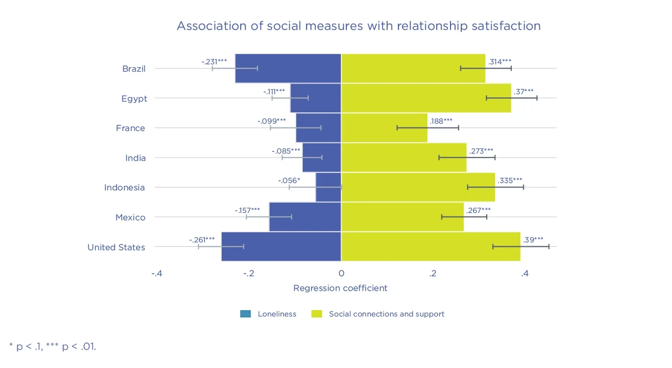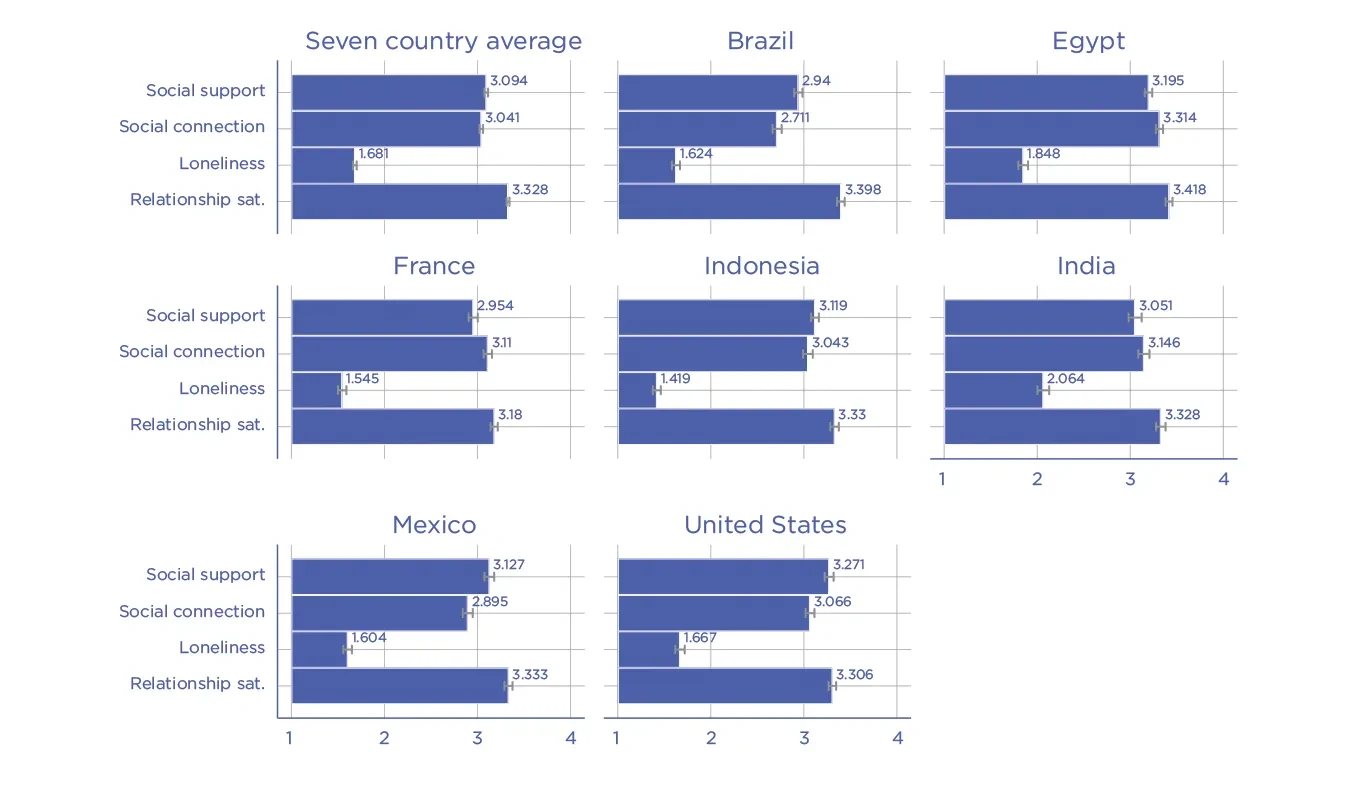 For social connections, the seven-country average was 3.04 with the significant departures being Brazil and Mexico lower (by 0.33 and 0.15, respectively), Egypt higher by 0.28, and France and India above the average by smaller amounts (0.07 and 0.11 respectively). For social support, the seven-country mean was 3.09 with significant departures being Egypt and the US higher (by 0.10 and 0.17 respectively) and Brazil and France lower (by 0.15 and 0.14 respectively). For loneliness the seven-country average was 1.68, with Egypt and India being higher (by 0.17 and 0.38 respectively) and Brazil, France, Indonesia and Mexico lower, (by 0.05, 0.13, 0.26, and 0.08 respectively). ↩︎