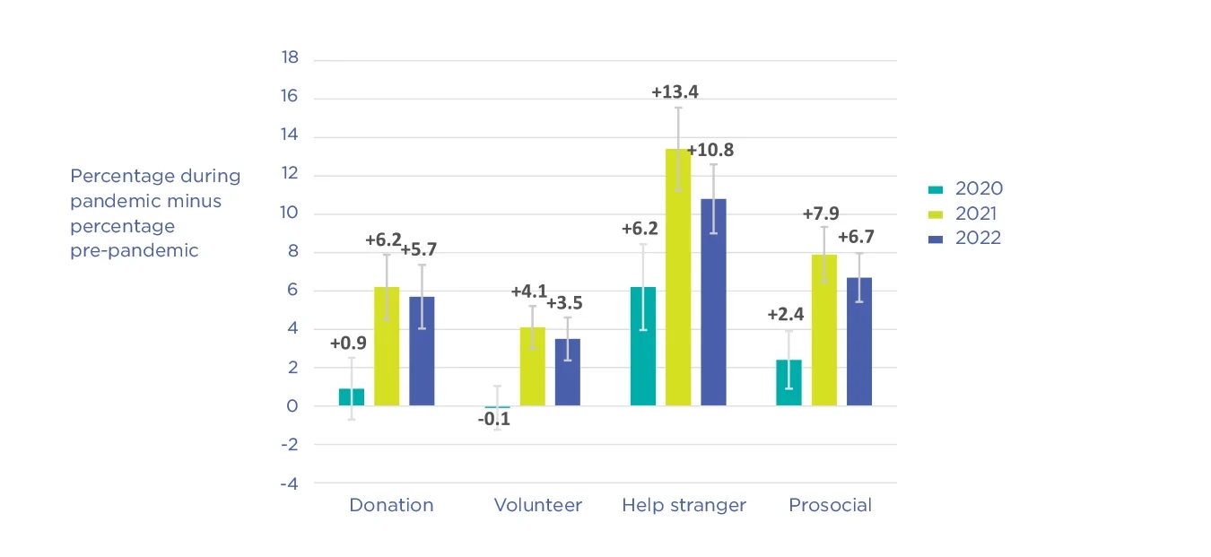 Next we update our reporting on the extent to which benevolence has increased during COVID-19, finding it still well above pre-pandemic levels.