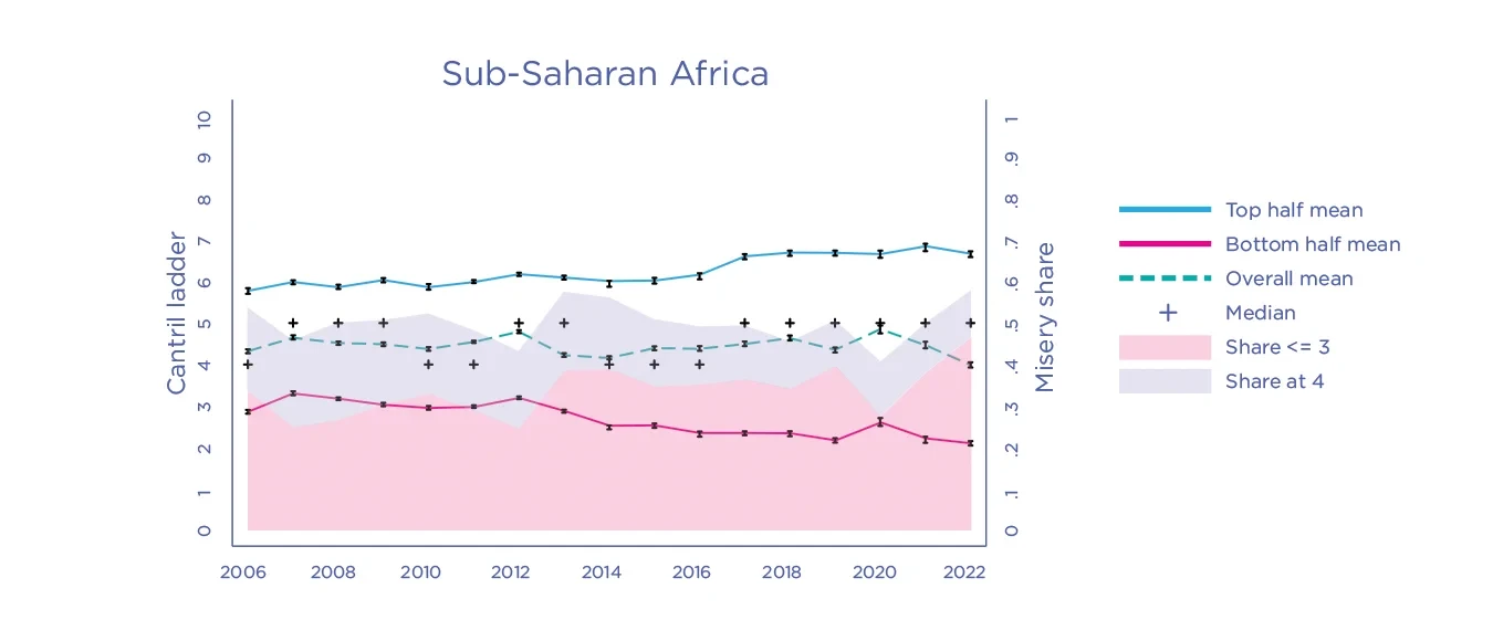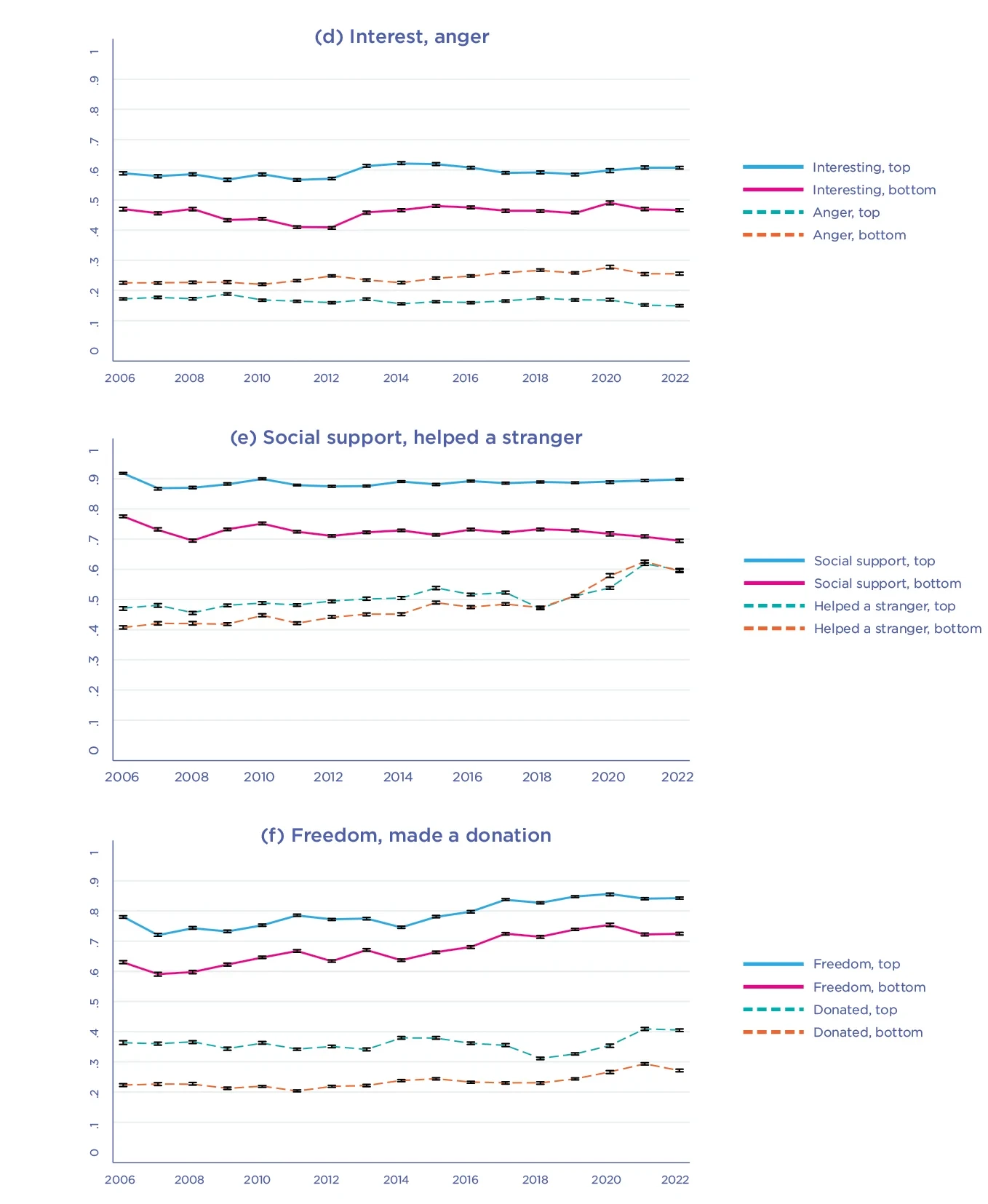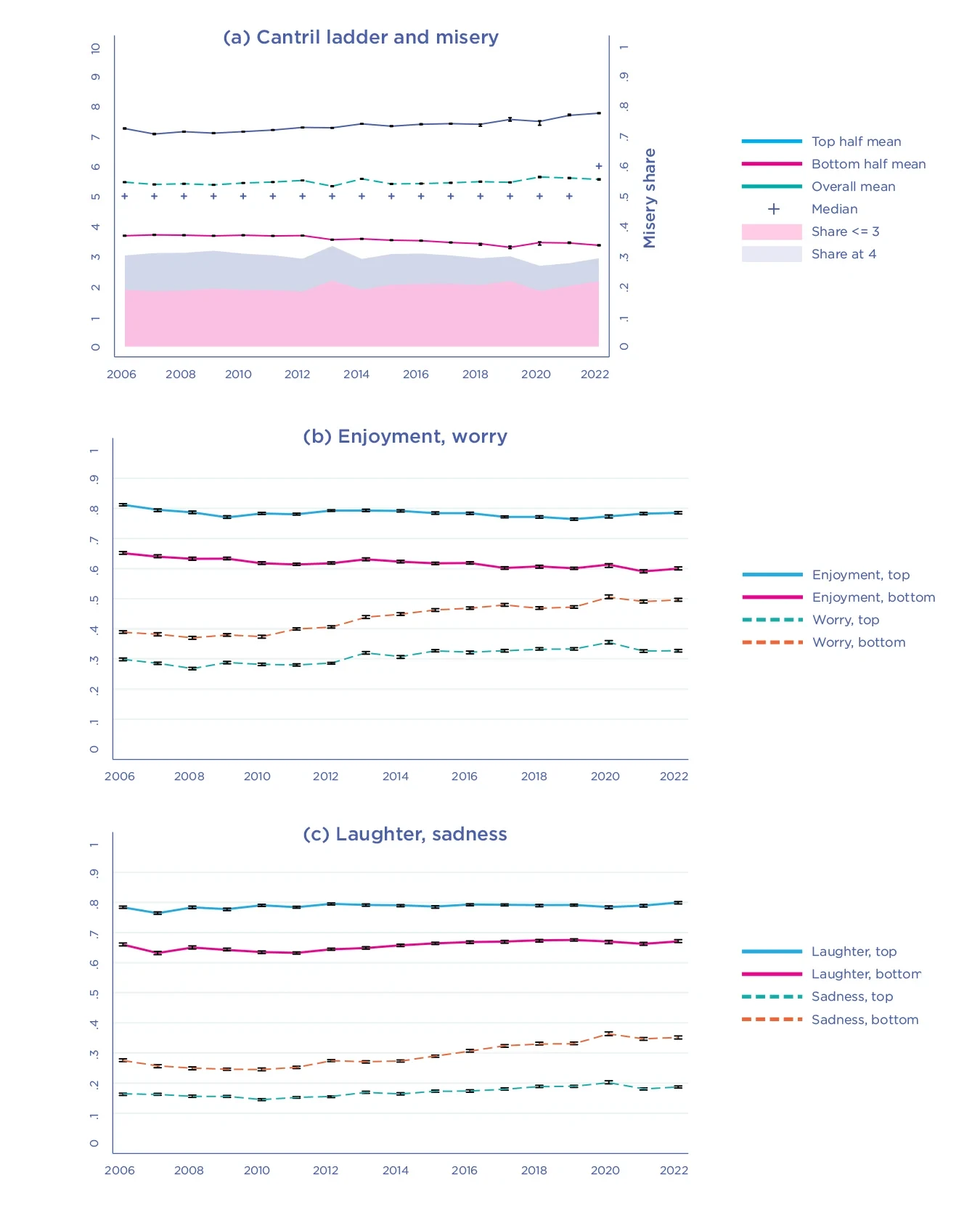 Figure 2.3 has several panels showing global inequality trends for life evaluations, emotions, and other key variables from the outset of the Gallup World Poll in 2005-2006 through 2022. For life evaluations, in panel (a), we present the median response along with the means of happiness in the happier and less happy halves of the population. We also present two measures of the frequency of misery, which we define in two alternative ways. The first is the share of respondents giving answers of 3 and below, while the second is the share giving answers of 4 and below.[30] Growth in either of these shares reflects a general lowering of life evaluations or an increasing concentration of responses at the bottom end of the distribution. The happiness gaps between the two halves of the population provide a good measure of trends in the inequality of well-being, while the misery ratios reveal the extent of very low life evaluations. The overall mean, illustrated as a dashed green line, shows how remarkably resilient global happiness has remained throughout the pandemic.