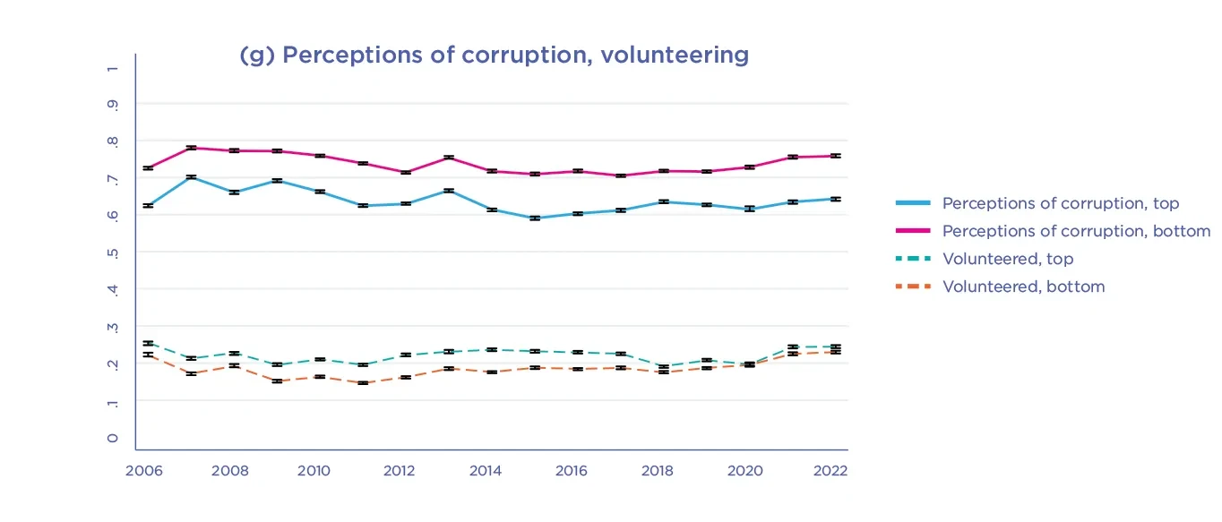 In panels (e) through (g) we pair one social pillar of well-being and one measure of benevolence in each panel, again contrasting the mean response in the more and less happy halves of the population.[31] The measures of benevolence illustrated by dashed lines in these panels have surged worldwide in the last 3 years—especially helping a stranger. Year after year we have found that generosity is a meaningful predictor of happiness. Our measure of generosity is based on the frequency of charitable donations in a given country, shown in panel (f) (see Technical Box 2). The growth in the broader set of benevolence measures helps explain the resilience of life evaluations during the pandemic. We expand on this theme further in the third section of this chapter.