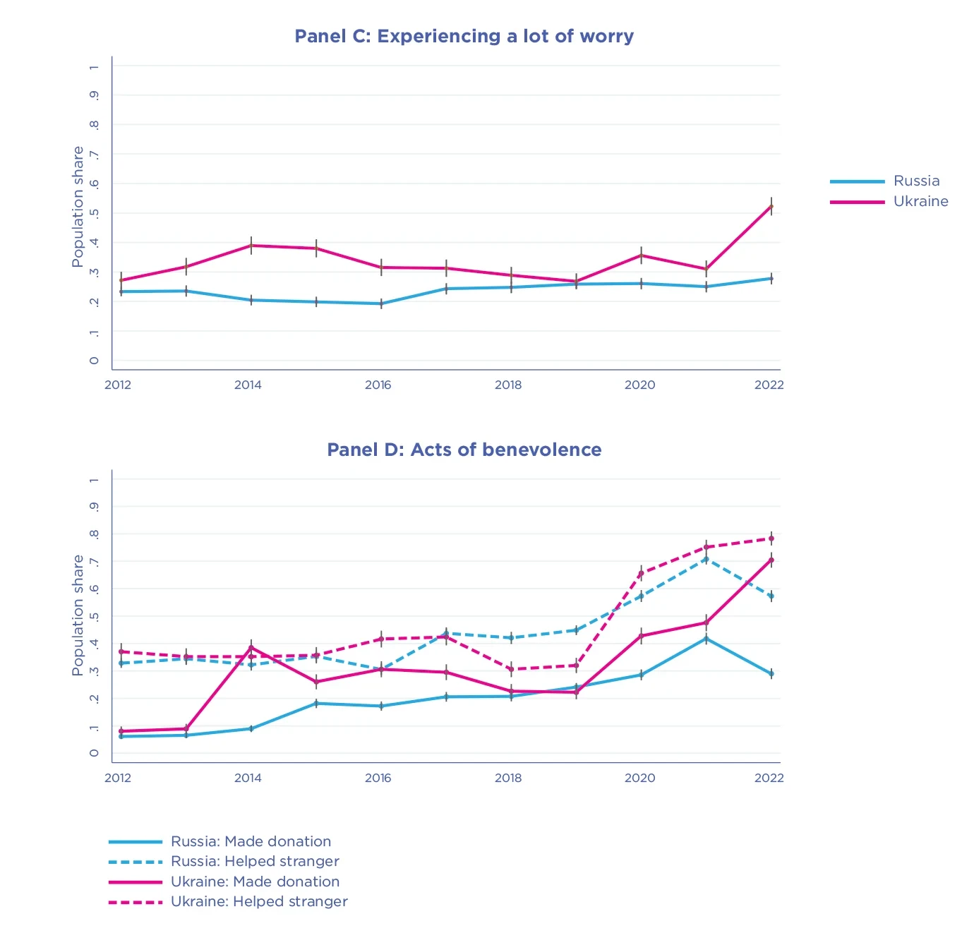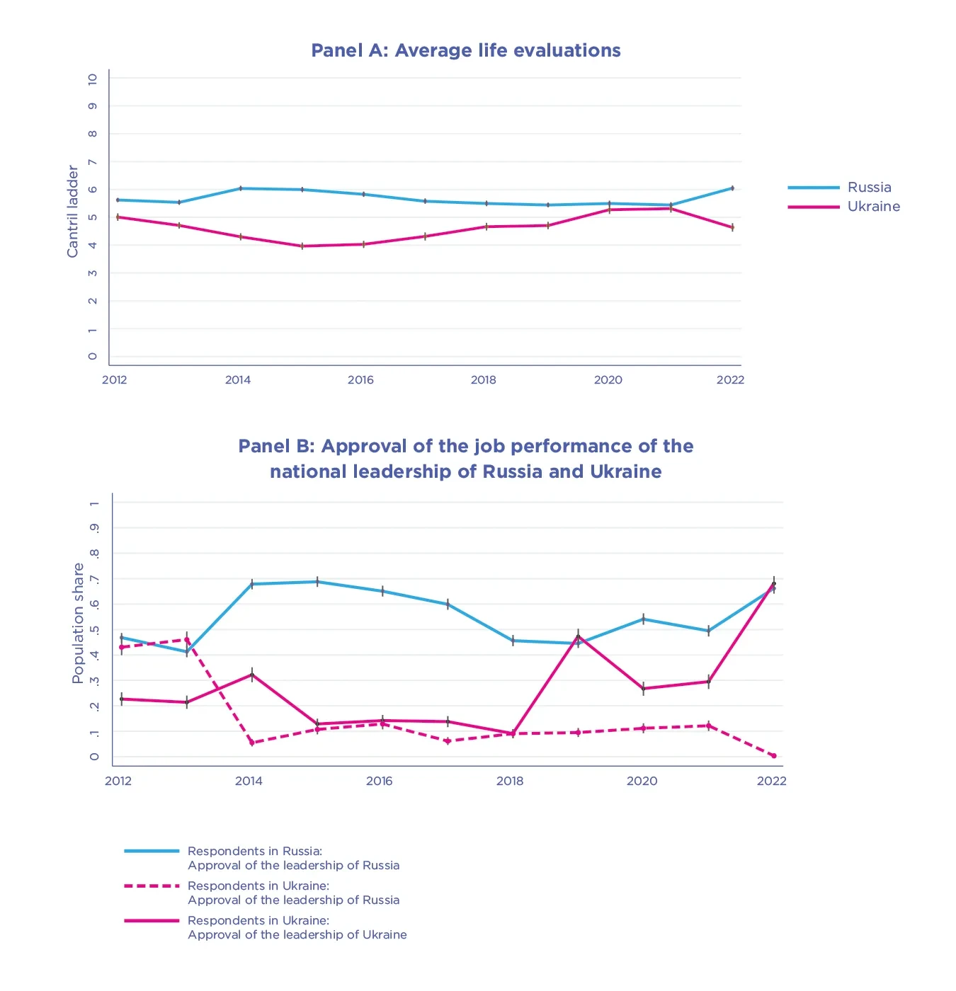 Then we present data on how the conflict between Ukraine and Russia since 2014, and especially in 2022, is associated with patterns of life evaluations, emotions, trust in governments, and benevolence in both countries.