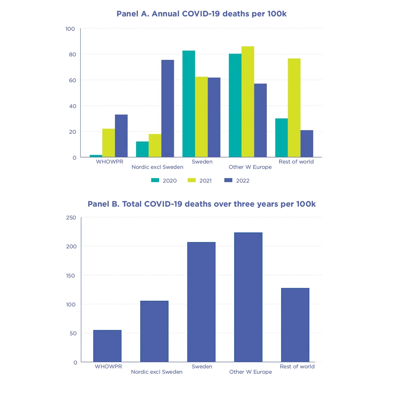 When a version of Panel B of Figure 2.5 is used to compare total directly reported COVID-19 deaths in 2020-2021 with all-cause excess deaths for the same years, the results are very similar for the four country groups at the left hand side of the Figure. These are all countries with relatively high quality measurements for both direct COVID-19 deaths and all-cause excess death rates. For the rest of the world, excess death rates, where they are available, appear to be significantly higher than the report COVID-19 death rates… ↩︎