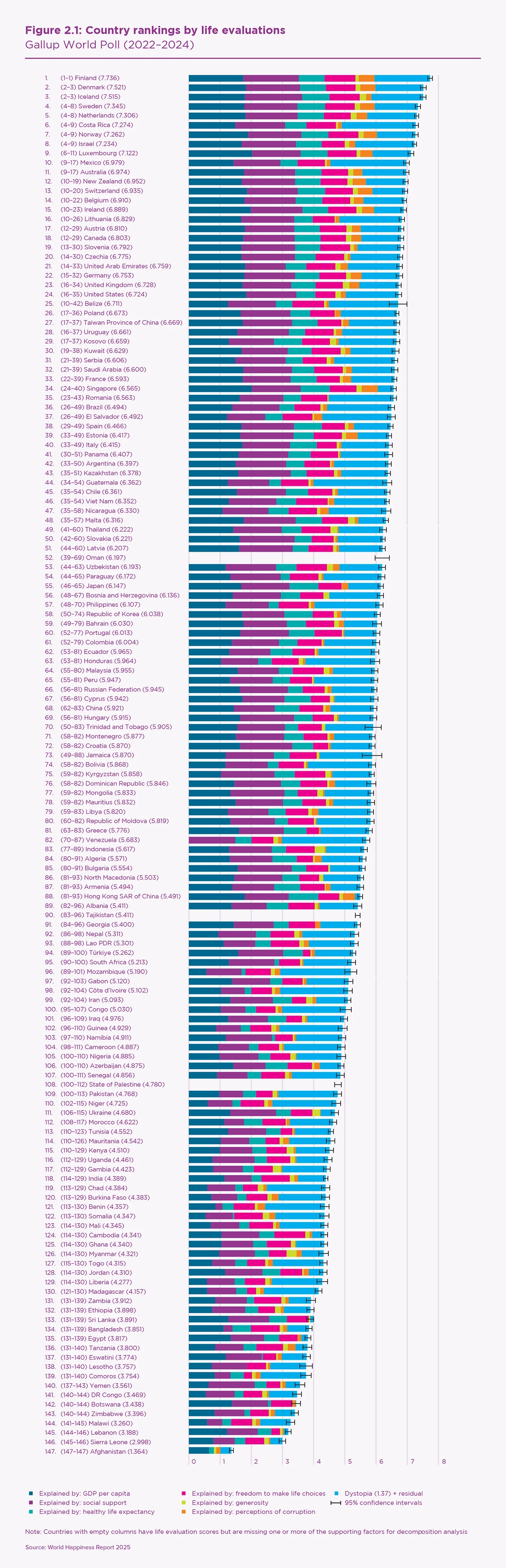 Second, there remains a large gap between the top and bottom countries – more than six points (on a 0–10 scale) between Finland at the top and Afghanistan at the bottom. The top countries are more tightly grouped than the bottom ones. The top twenty have a spread of less than one point on the 0–10 scale, with the corresponding spread among the bottom twenty being three times as great. The remaining 100-odd countries cover the remaining 2.3 points of the total range. This means that relatively modest changes in a national average can lead to a large shift in rank, as illustrated by 95% confidence regions of more than 25 ranks for several countries in the middle of the global list.