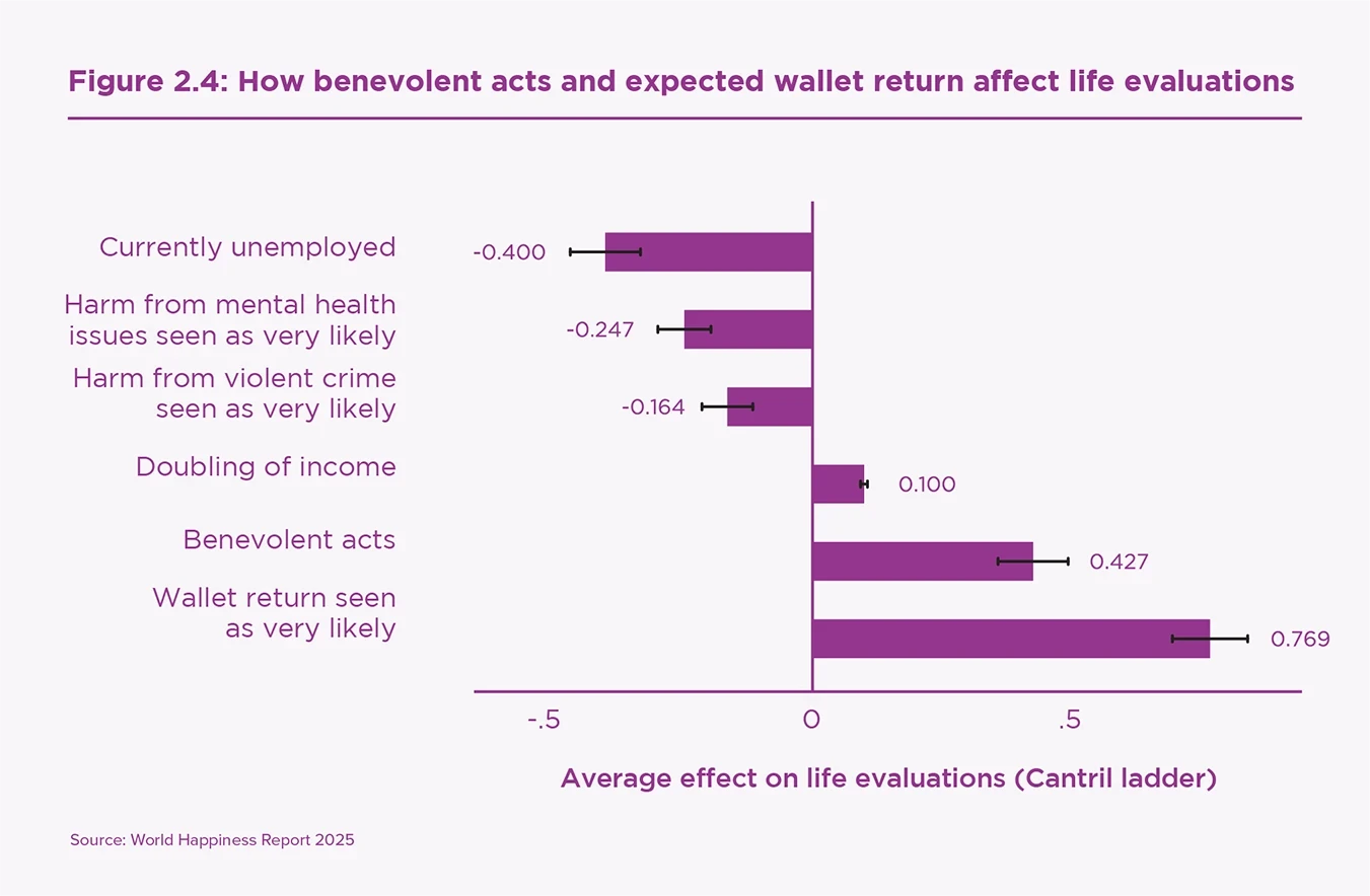 - Engaging in benevolent acts and expecting kindness from others both matter for individual happiness levels. The effect of expected wallet return is almost twice as large as for the frequency of benevolent acts (Figure 2.4).