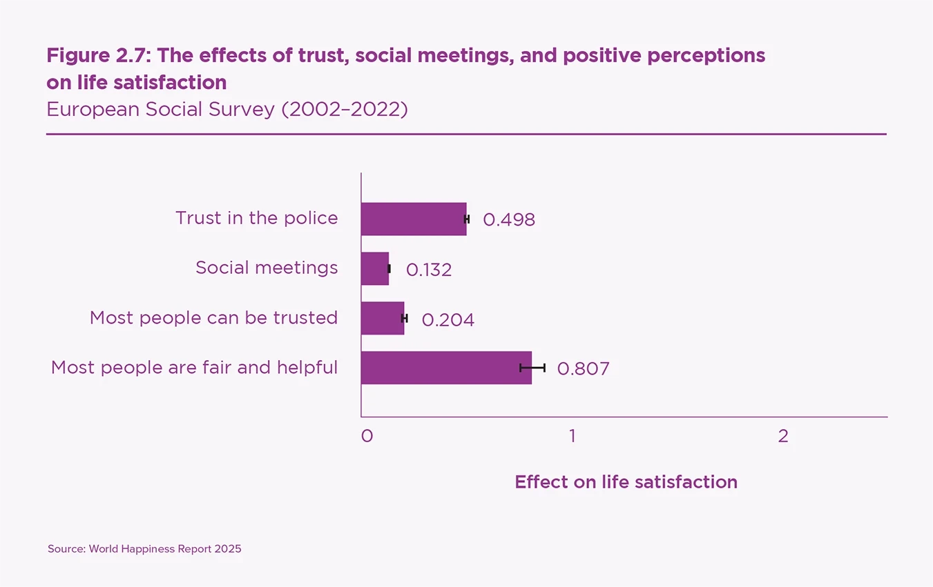 - Expected fairness and kindness reduce happiness inequality and add to the benefits of trust and social connections (Figures 2.6 and 2.7).