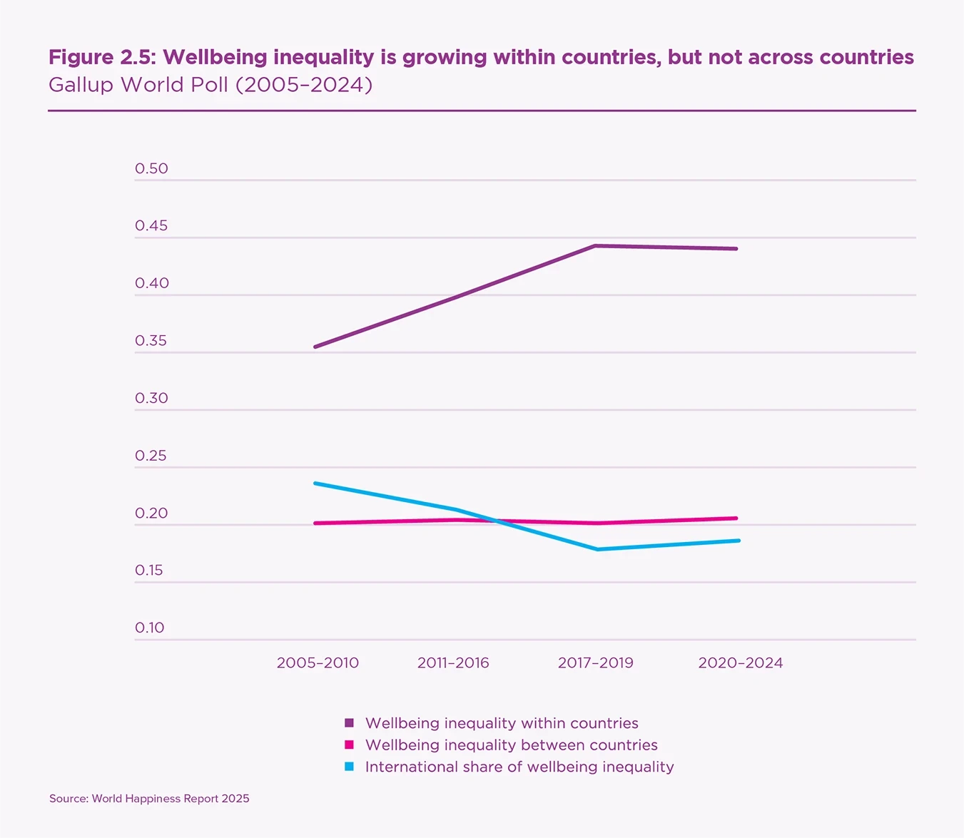 - Happiness inequality within countries has increased by about one-quarter over the past two decades, while happiness inequality between countries has remained roughly constant (Figure 2.5).