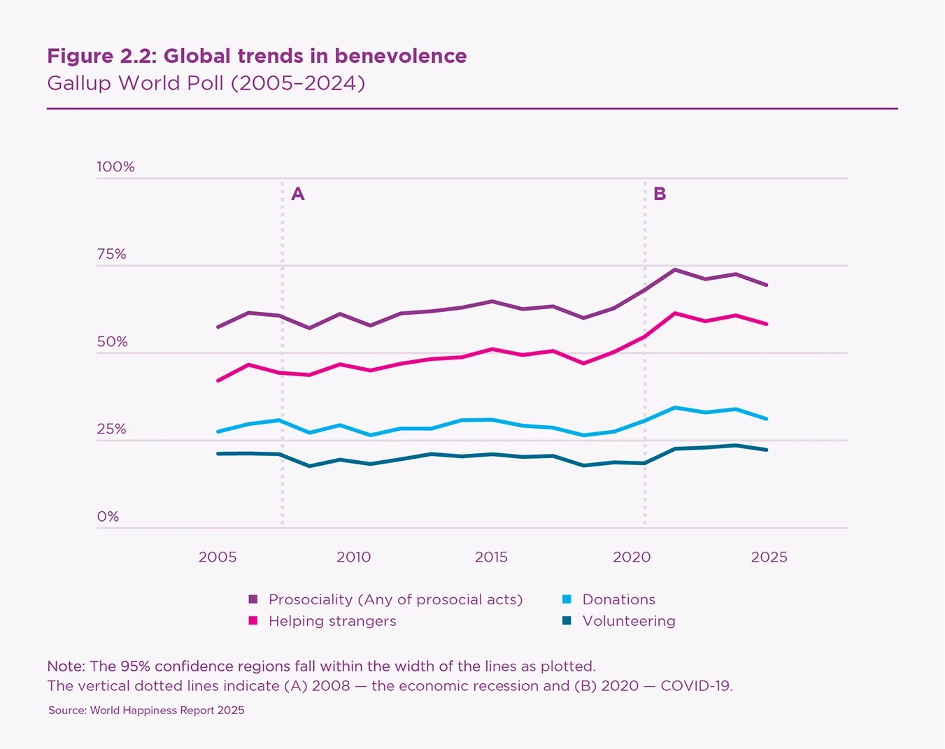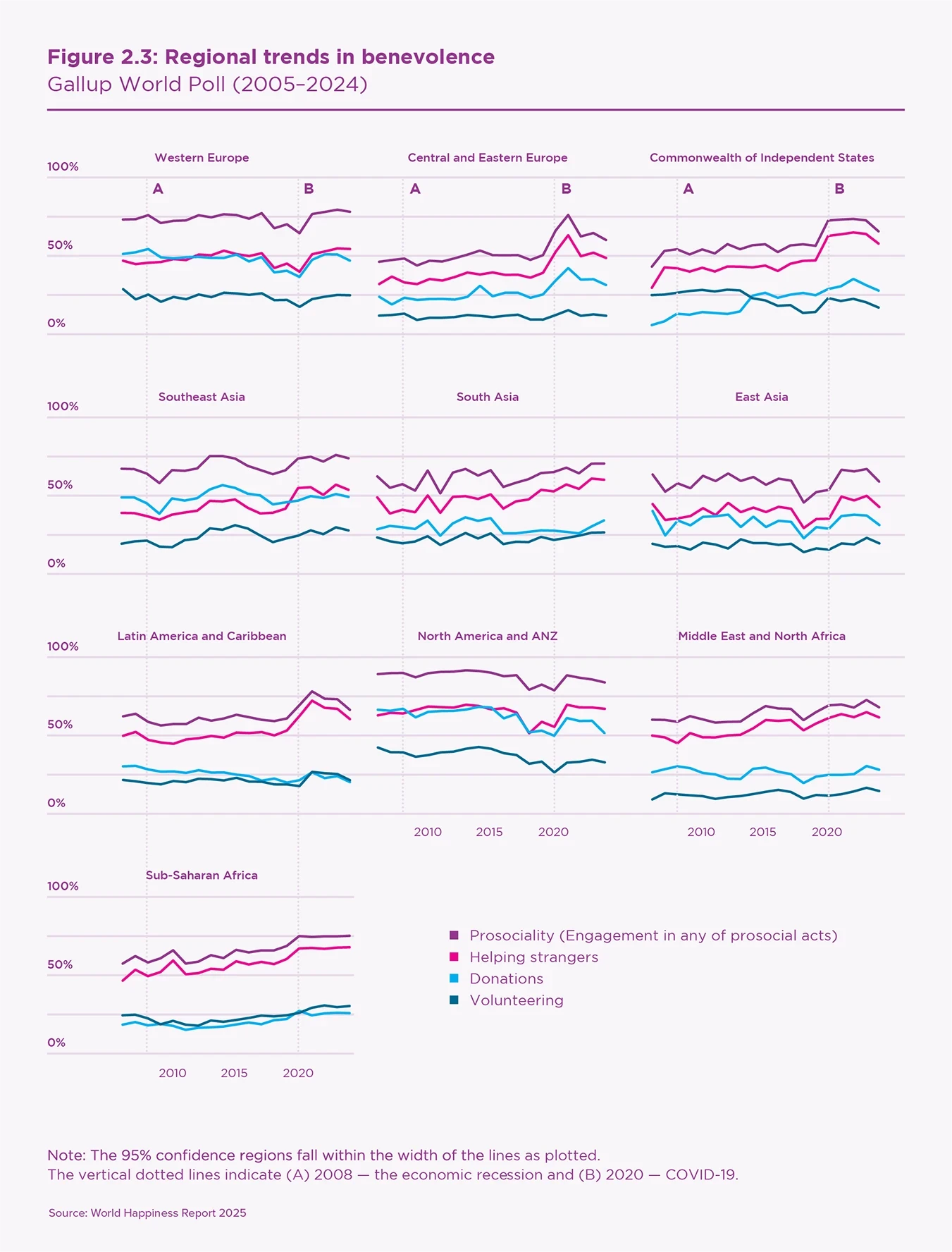- During 2024, the COVID-era surge in benevolent acts fell significantly but remains more than 10% higher than 2017–19 levels almost everywhere.