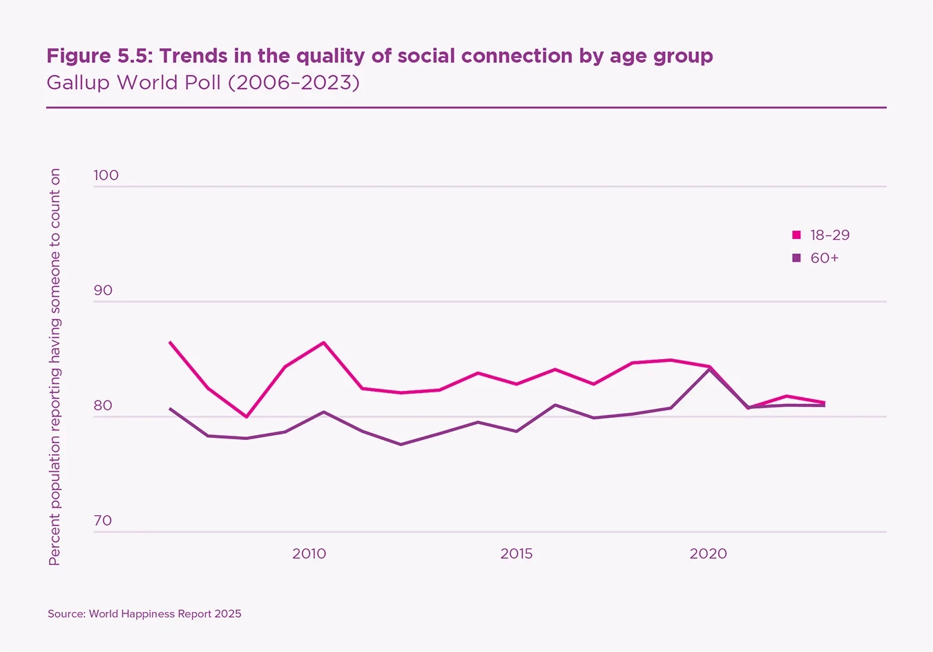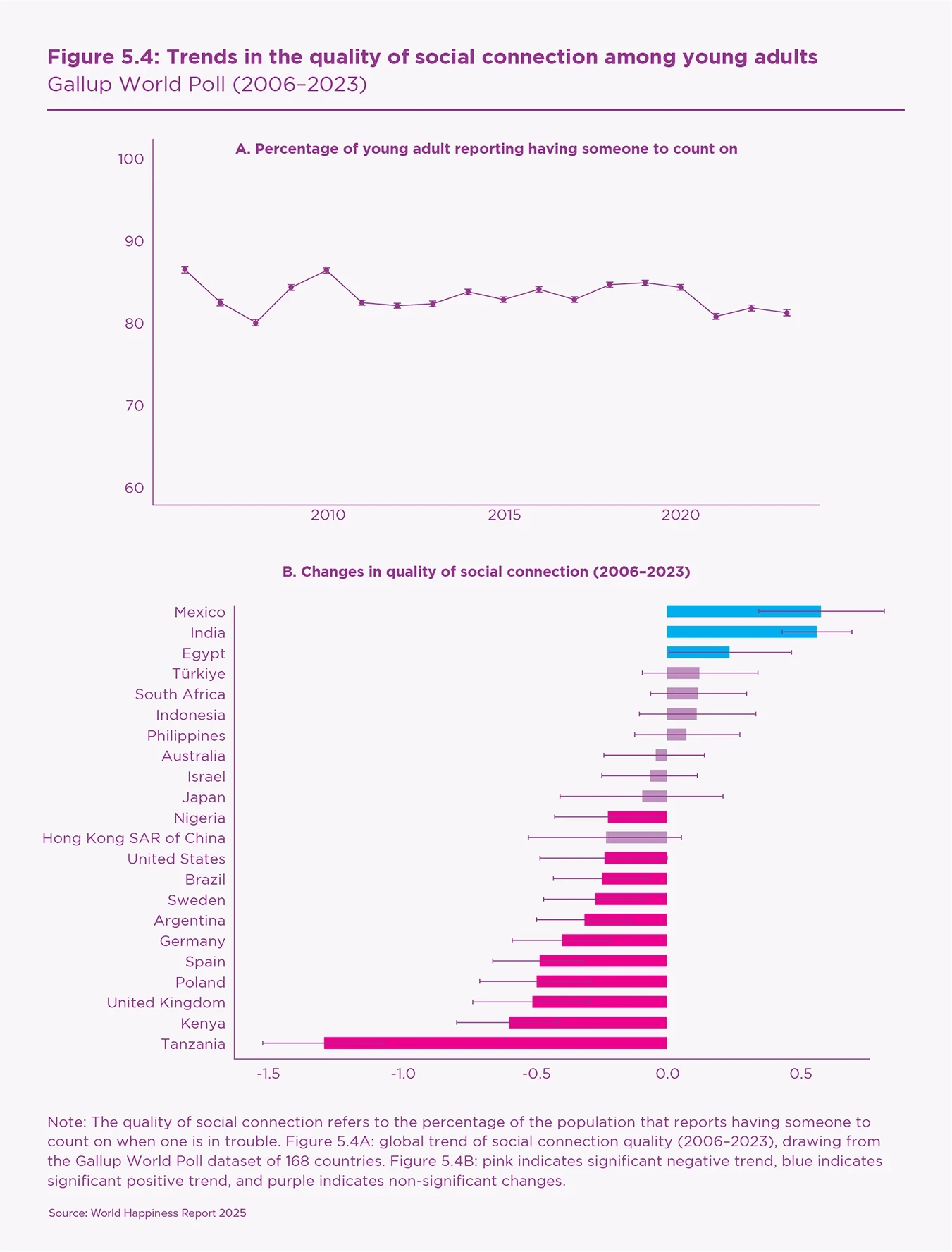 - Social disconnection is prevalent and increasing among young adults: In 2023, 19% of young adults across the world reported having no one that they could count on for social support, representing a 39% increase compared to 2006.