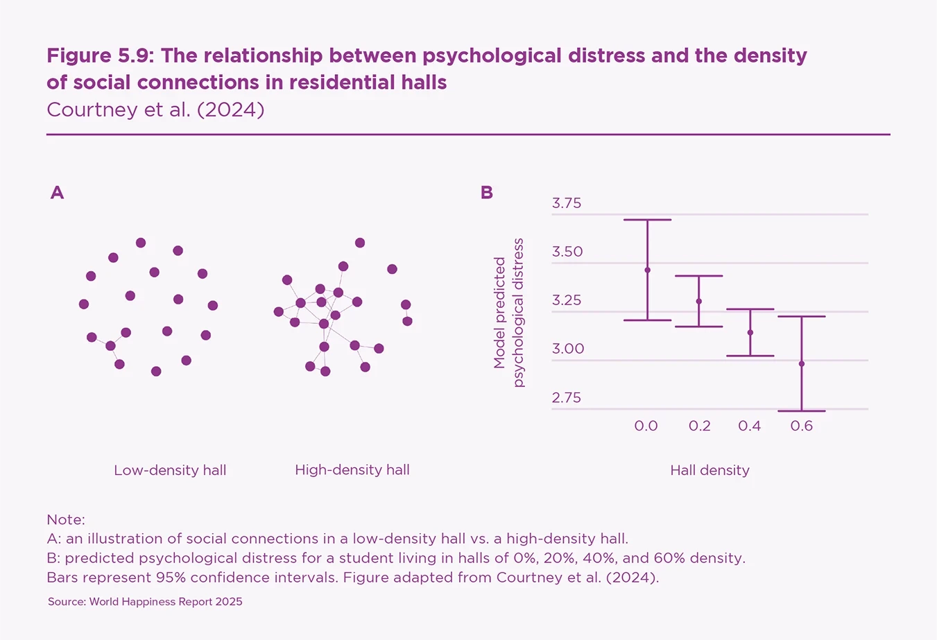 The results showed that these social factors significantly influenced wellbeing. Consistent with the evidence reviewed above, attributes of a student’s direct social network are significantly associated with subjective wellbeing. Moreover, the density of a student’s social microclimate also plays a significant role in mental health. Students who lived in high-density halls, where community members are more interconnected, reported lower levels of psychological distress and higher life satisfaction (Figure 5.9B). These effects remained robust even after accounting for individual traits and characteristics of one’s direct social network. Thus, the density and cohesion of a student’s social microclimate may also shape subjective wellbeing, as well as their immediate social network.