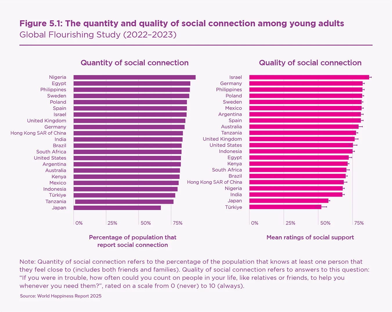 Countries also varied in the quality of social connection reported by young adults. Participants rated how often they could count on people in their lives, such as relatives or friends, to provide help whenever needed. Overall, about 76% of young adults in the GFS sample reported that they can often count on people in their life for social support (indicated by a rating of 5 or higher on a 0–10 scale). Israel ranks the highest in the quality of social connections, followed closely by Mexico and Argentina (Figure 5.1B), indicating that young adults in these countries generally feel confident about the availability of help. By contrast, young adults in Japan and Türkiye report the lowest levels of social support.