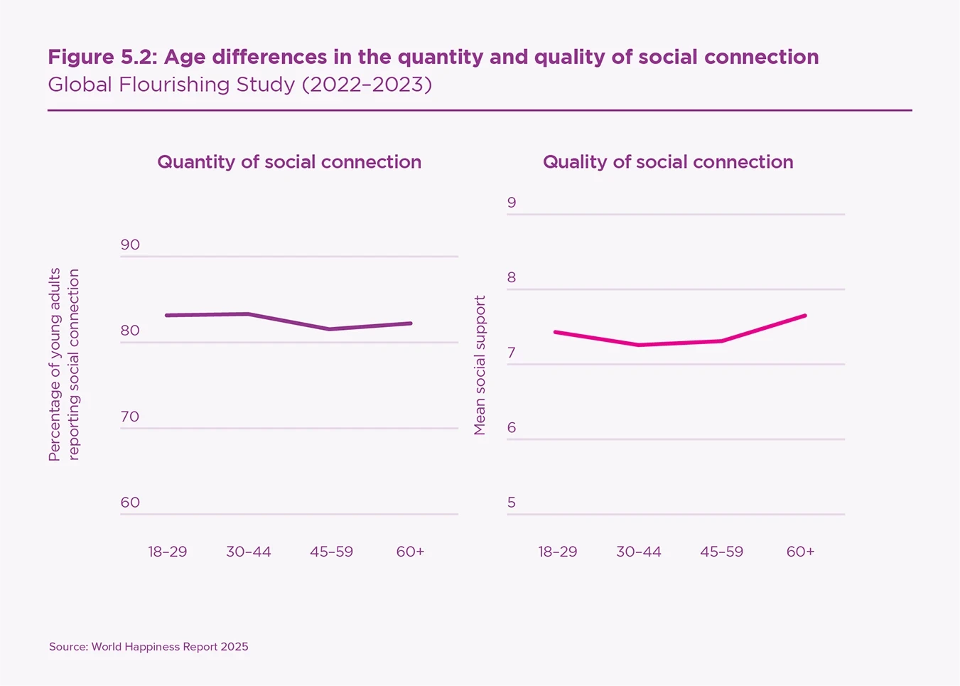 In Figure 5.2, we compare the social connection of young adults with other age groups. Consistent with previous observations,[17] adults older than 45 years report lower quantity of social connection compared to younger adults, representing higher levels of social isolation. For quality of social connection, the pattern follows a U-shaped curve, with both young adults (<30 years) and older adults (>60 years) reporting higher levels of social support. These patterns likely reflect the shifting priorities that come with age. Young adults often focus on expanding their social networks, while older adults may prioritise fewer but emotionally closer relationships, optimising their connections to benefit subjective wellbeing.[18]
