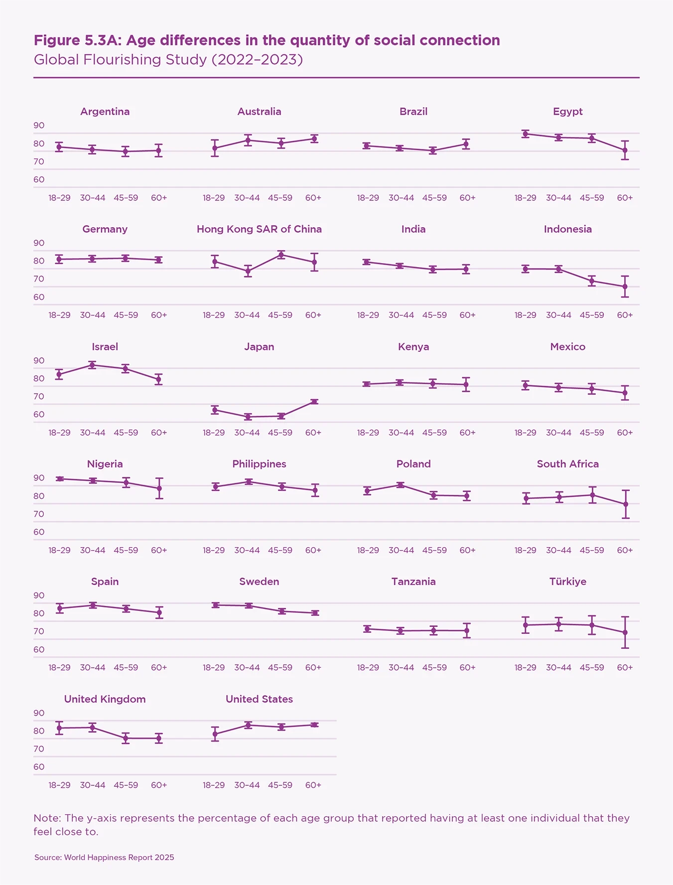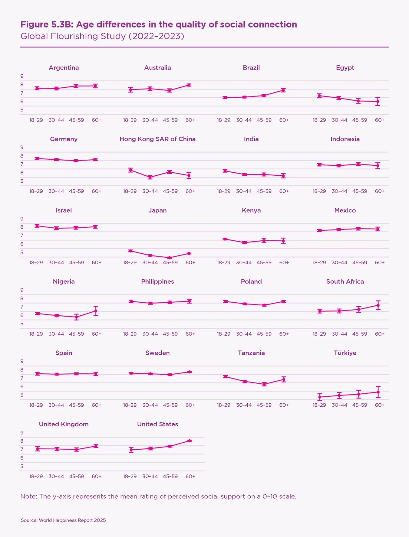 Unlike other nations, young adults in the US also report lower quality of connection than other age groups (Figure 5.3B). Mirroring these patterns, World Happiness Report 2024 also highlighted a decline in the US happiness ranking, largely driven by a drop in wellbeing in the young adult age group.[19] Although not definitive, this provides intriguing preliminary evidence that relatively low connection among young people might factor into low wellbeing among young Americans.