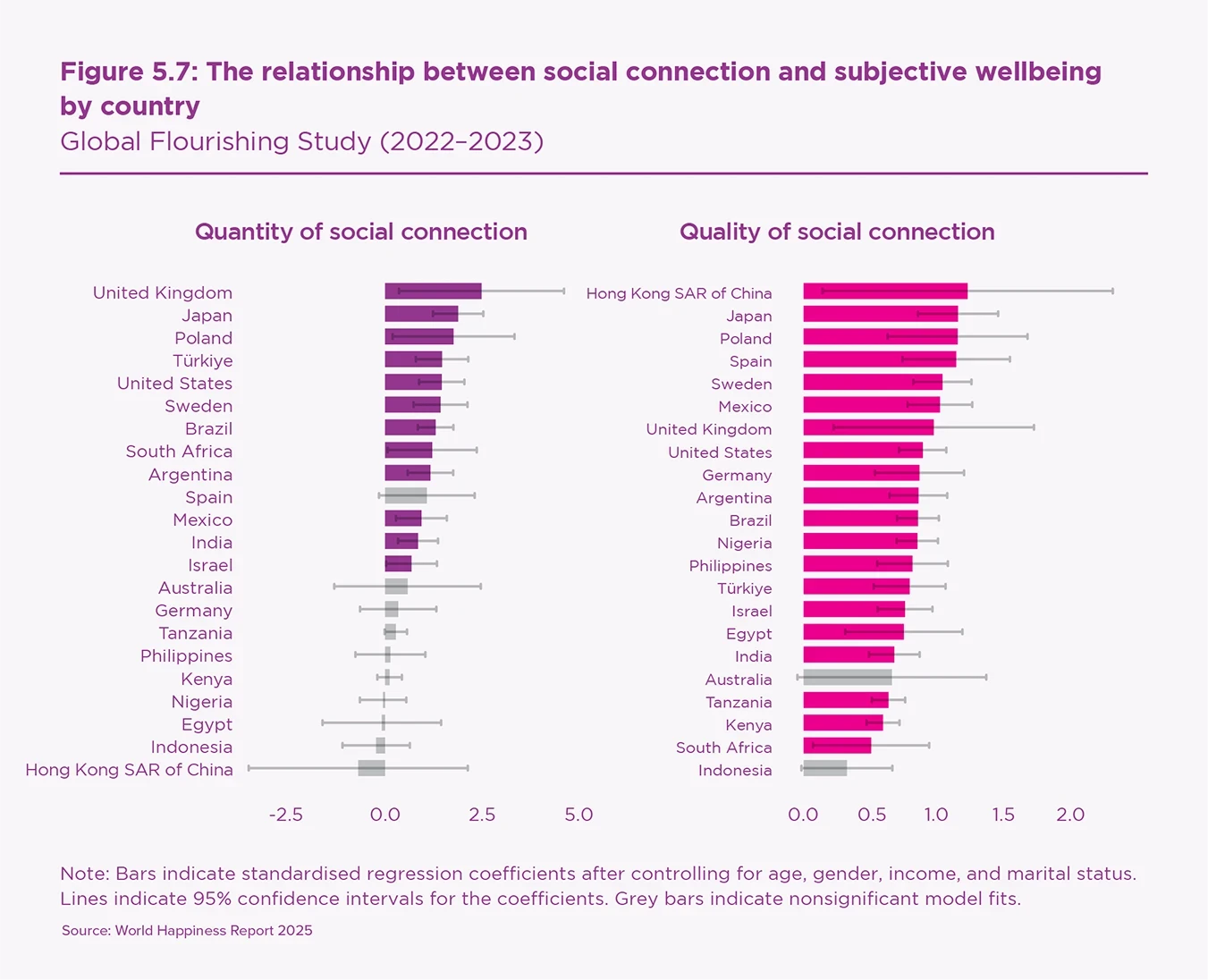 In a few countries which scored highest on social connection (such as Nigeria and Egypt) we do not observe significant associations between social connection and wellbeing (Figure 5.7). For example, over 90% of young adults in Egypt reported having at least one person that they feel close to. Because only a small proportion of this group reports lacking social connection, it’s difficult to relate social connection with wellbeing among this group.