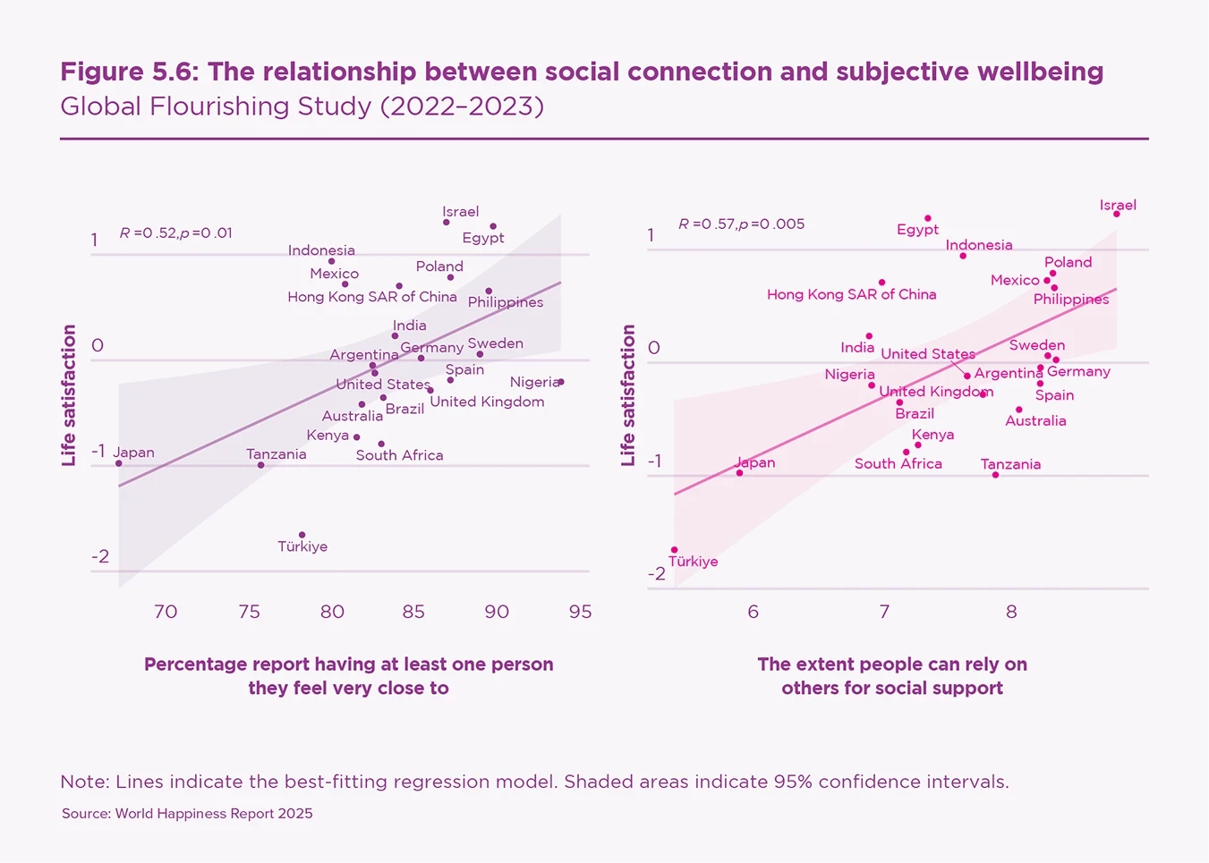 Similarly, we observe a significant positive association between the quality of social connection and wellbeing. A 1-point increase in perceived social support is associated with a 0.29-point increase in life satisfaction.[22] Data from all 22 countries and regions in the GFS data showed a positive association, although the size of this positive association varied slightly across countries.