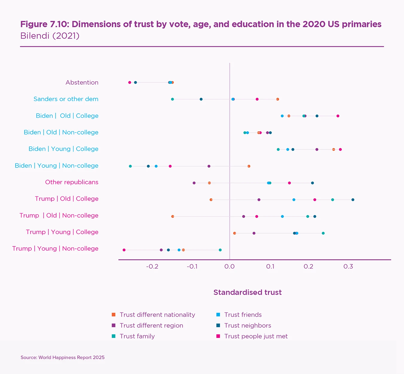 In 2020, Donald Trump was the only Republican candidate. The rally of traditional wealthy Republican voters (who voted for other Republican candidates in the 2016 presidential primaries) explains this group’s above-average life satisfaction and average level of trust. By contrast, all Democrat voters displayed low life satisfaction and average or above-average levels of trust.