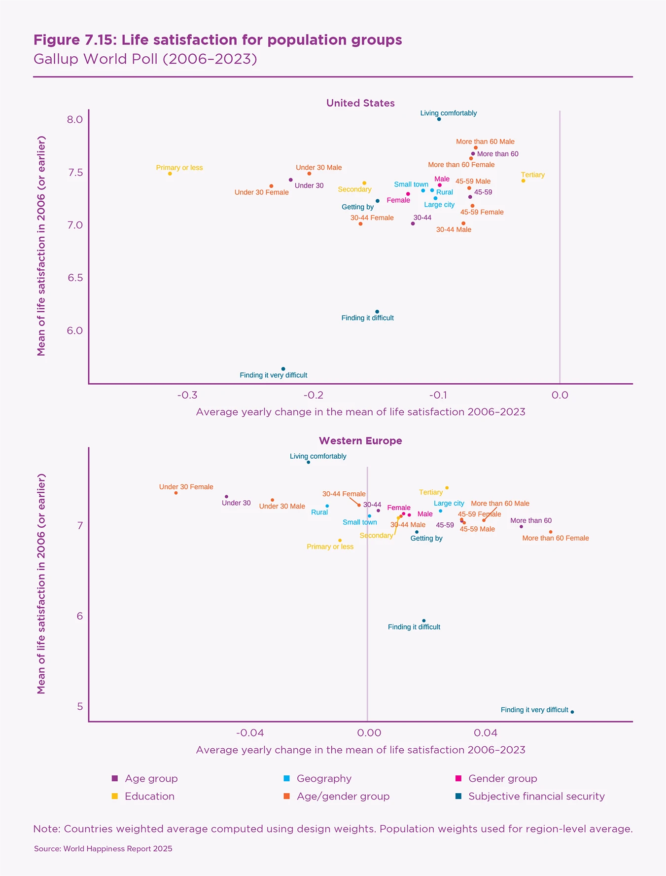 Figure 7.15 displays the average change in life satisfaction for different population groups based on age, gender, education, economic status, and geography. The groups with increasing life satisfaction stand to the right of the dotted vertical bar and the groups with decreasing satisfaction stand to the left. The vertical axis shows the initial level of life satisfaction measured in 2006. The downward trend in life satisfaction is particularly steep among young people under 30, especially women, both in Western Europe and the United States, as already underlined in World Happiness Report 2024.