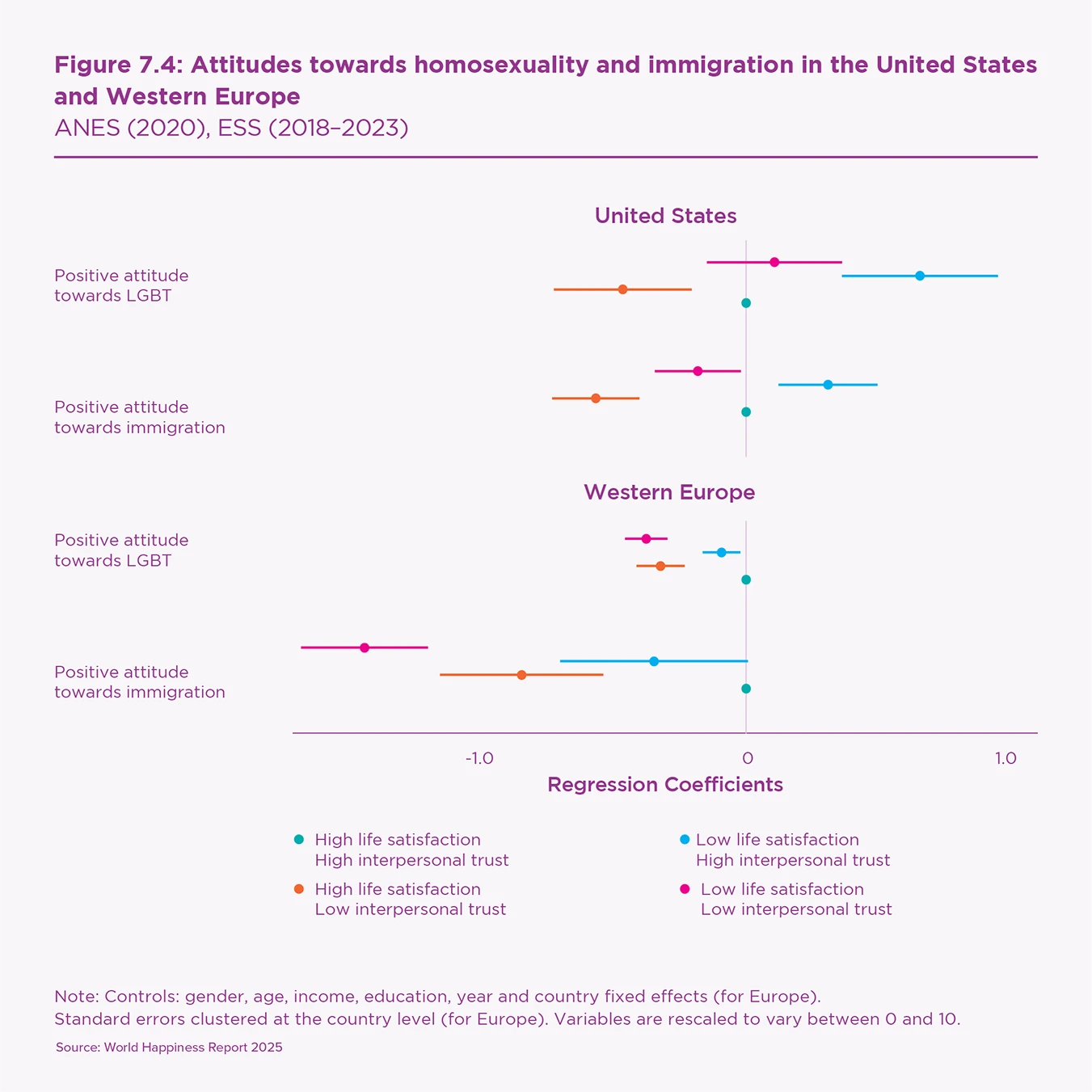 The crucial role of social trust in shaping cultural values is powerfully illustrated by the contrast between the two groups of citizens with low life satisfaction. The attitudes of those with low trust (pink) are almost twice as negative as those with high trust (blue). These less satisfied but trusting citizens (blue) are more tolerant towards homosexuality and immigration than highly satisfied but distrusting people (orange). Thus, unlike political ideology, which maps onto the distribution of life satisfaction, the distribution of cultural ideology is aligned along the axis of interpersonal trust, as shown earlier in Figure 7.2B.