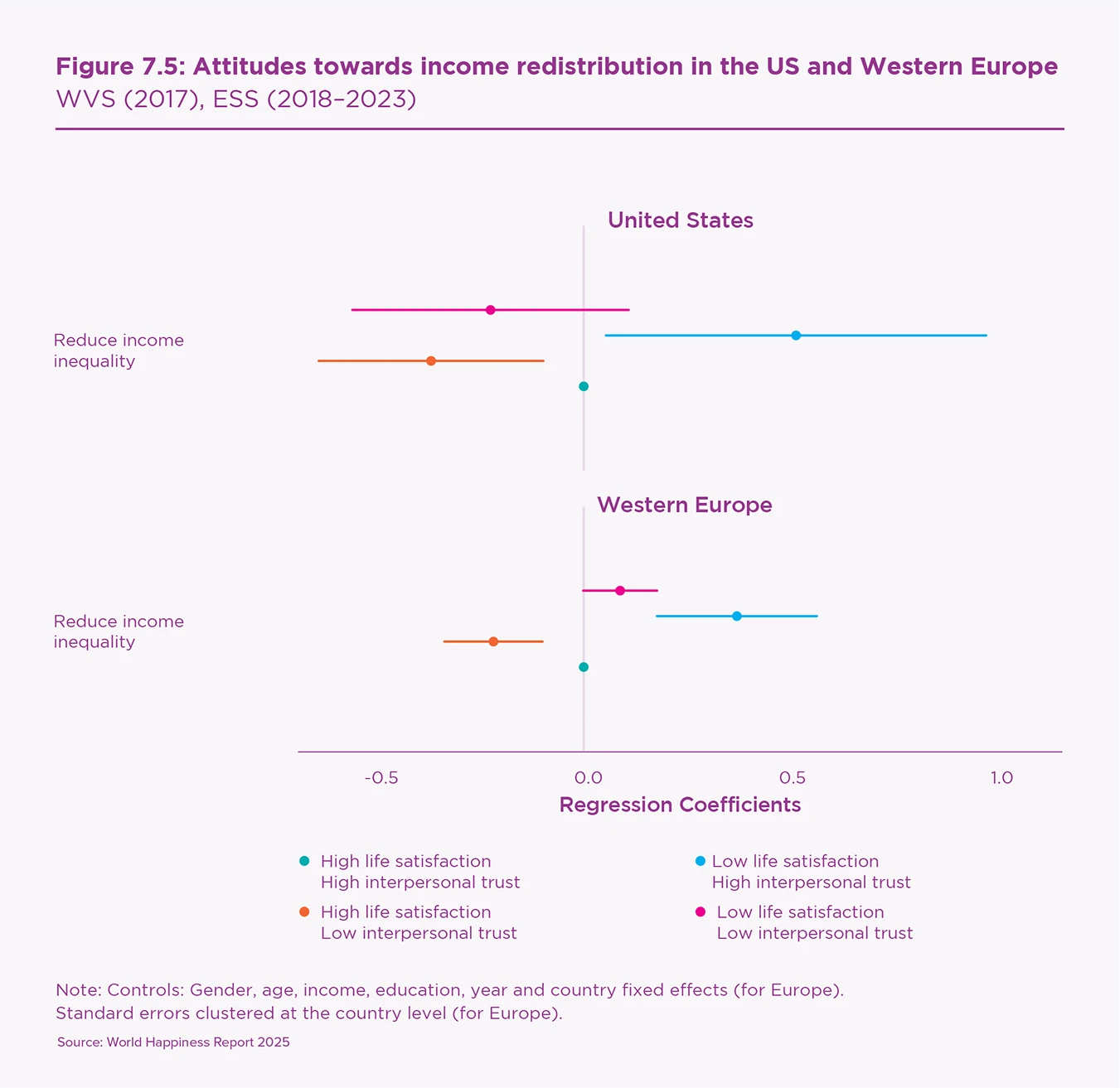 To encompass these patterns in a unifying framework, we construct a matrix of interpersonal trust and life satisfaction and show how voters in the United States and Western Europe are positioned in the matrix over the last decade. We test the relevance of this framework by combining various databases: the Gallup World Poll (2004–2024), the European Social Survey (2002–2023), the General Social Survey (1970–2023), and the World Values Survey (1981–2023). We show how our new paradigm offers additional insight for a more general analysis of political preferences. In particular, how social trust and life satisfaction combine to explain otherwise puzzling ideological attitudes. For example, why populist right-wing voters, while poorer than the average, tend not to support income redistribution policies.