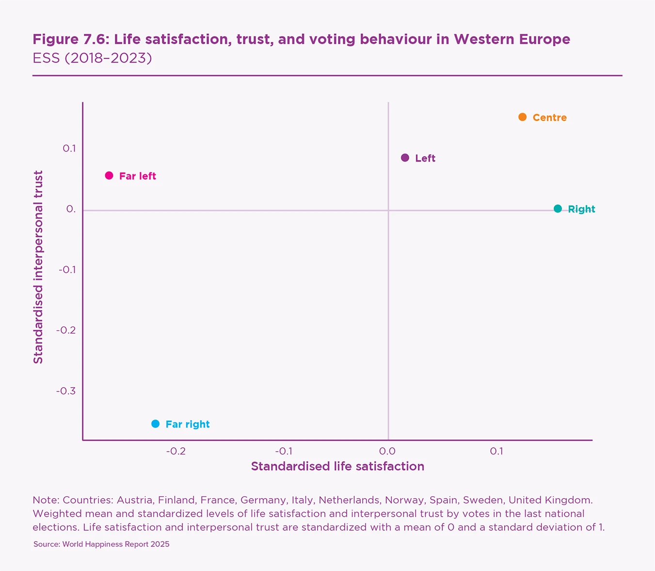 Unhappy people are attracted by the extremes of the political spectrum. Low-trust people are found more often on the far right, whereas high-trust people are more inclined to vote for the far left.