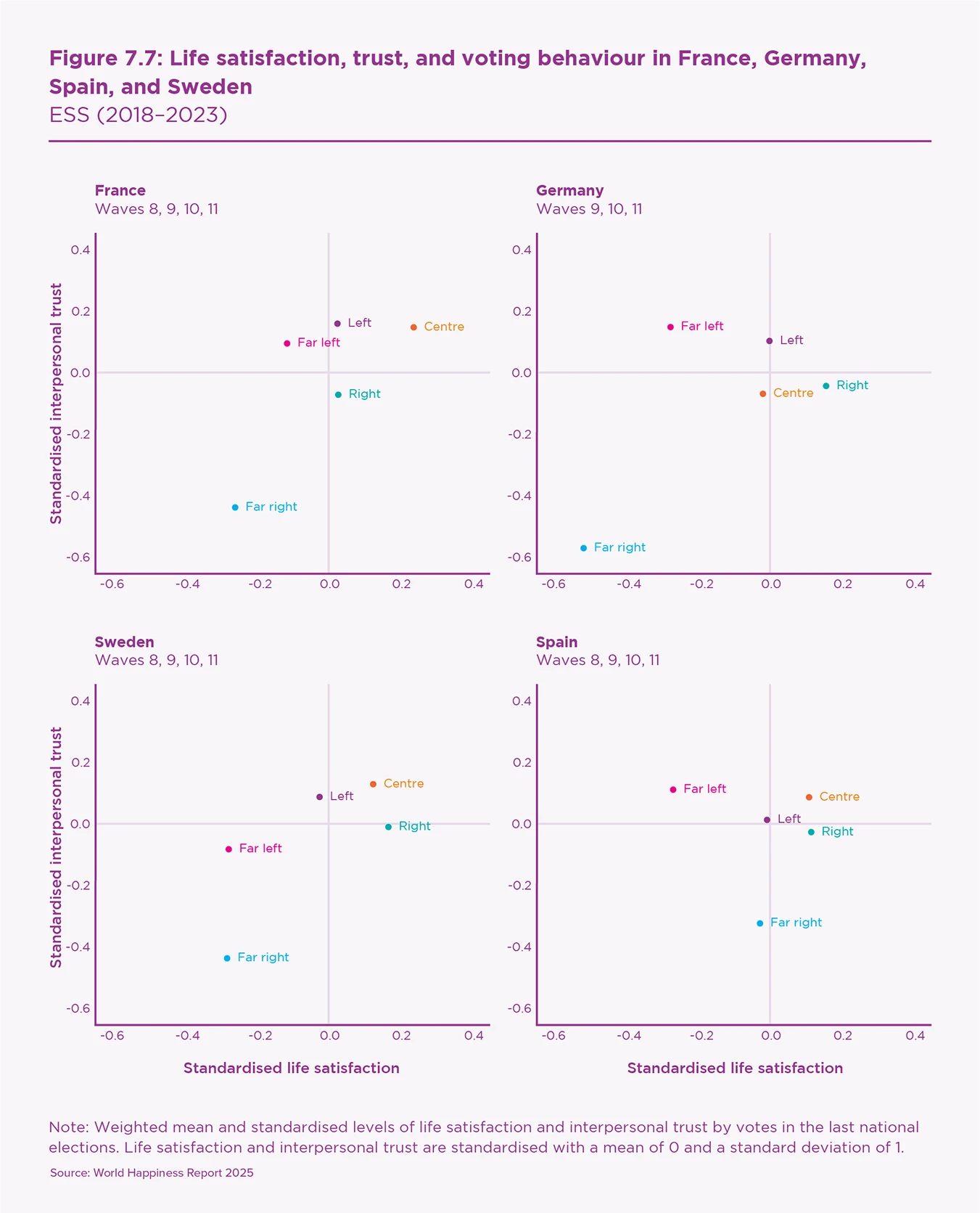 Figure 7.7 highlights these results for a selection of European countries from the south (Spain), the centre (France and Germany), and the north (Sweden). In all countries, far-right voters stand much lower on social trust measures than electors for any other political party. In general, voters for centre-right, or centre-left parties have above-average life satisfaction and social trust.