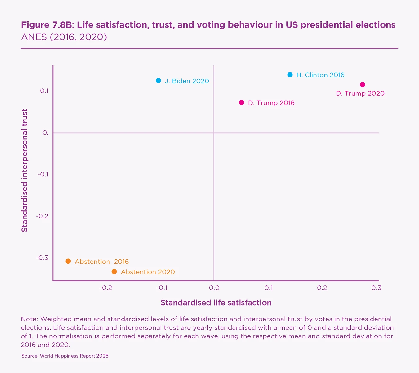 In 2016, votes for Hillary Clinton were votes for the status quo, coming from people with high trust and high life satisfaction. Clinton voters are wealthier than the average (which is highly correlated with their life satisfaction) and their high level of trust makes them more favourable to immigration and globalisation. Sanders voters also express a higher level of trust than the average, but a lower level of life satisfaction. This pattern explains why they vote for a candidate whose main campaign motto was about the redistribution of income and taxation of the wealthiest. Trump voters displayed different features. Their level of life satisfaction is slightly higher than the national average (this is due to the composition of this electorate, combining both the white working and middle class and the wealthy ), but a low level of trust. This is consistent with both the anti-tax and anti-immigration platform of Trump.