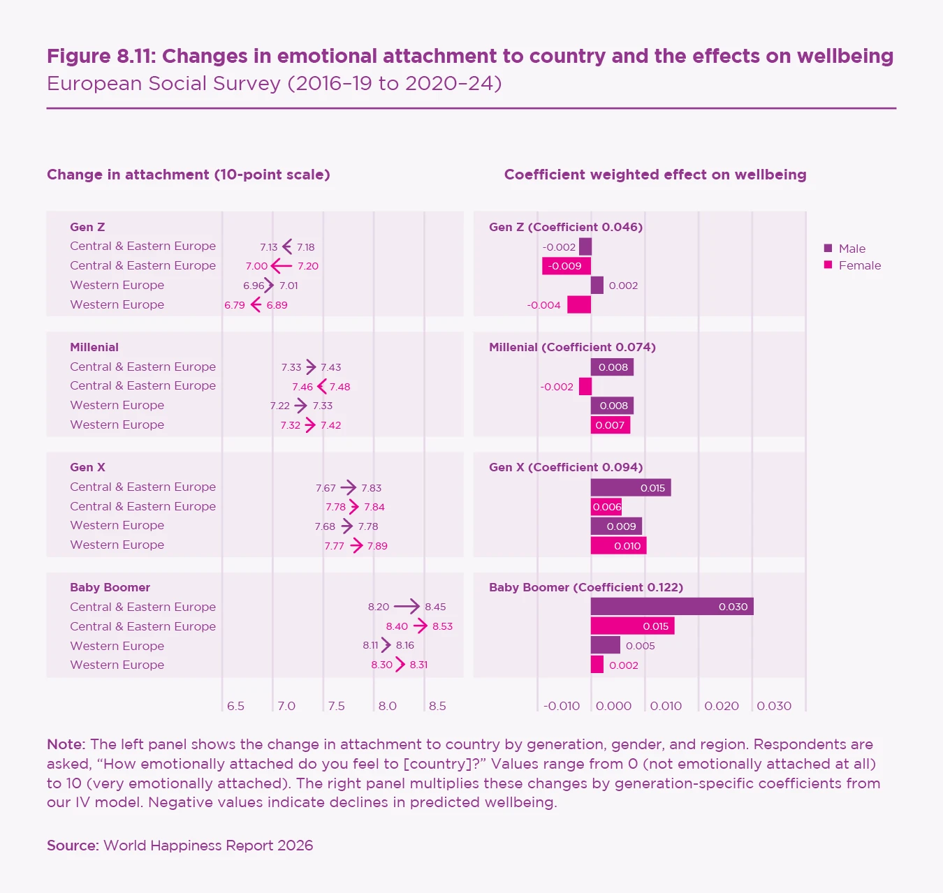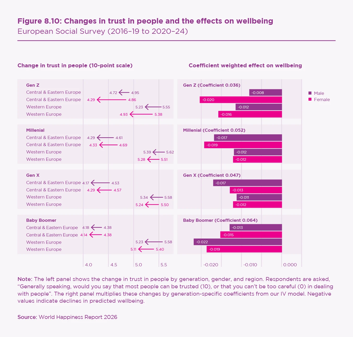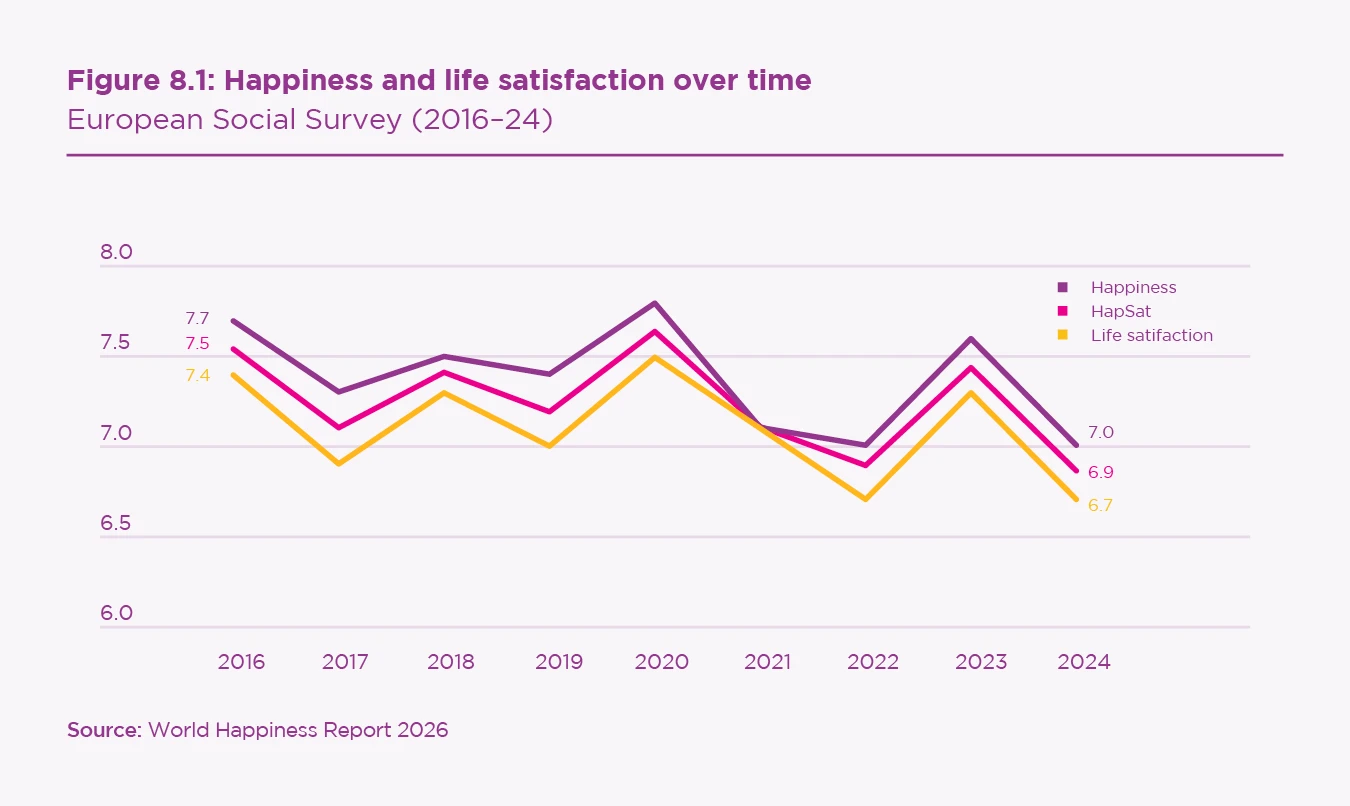 The social and emotional foundations of wellbeing have deteriorated most for younger Europeans, especially in Western Europe. Declines in interpersonal trust, institutional trust, perceived social activity, and social meeting frequency are largest for Gen Z and Millennial women. In contrast, older cohorts show more resilience, supported by rising attachment to country and, in many Central and Eastern European countries, improved feelings of safety.