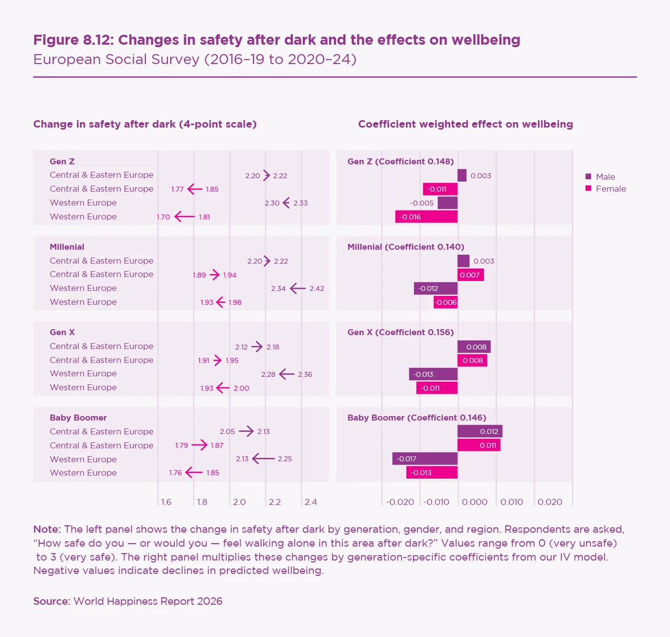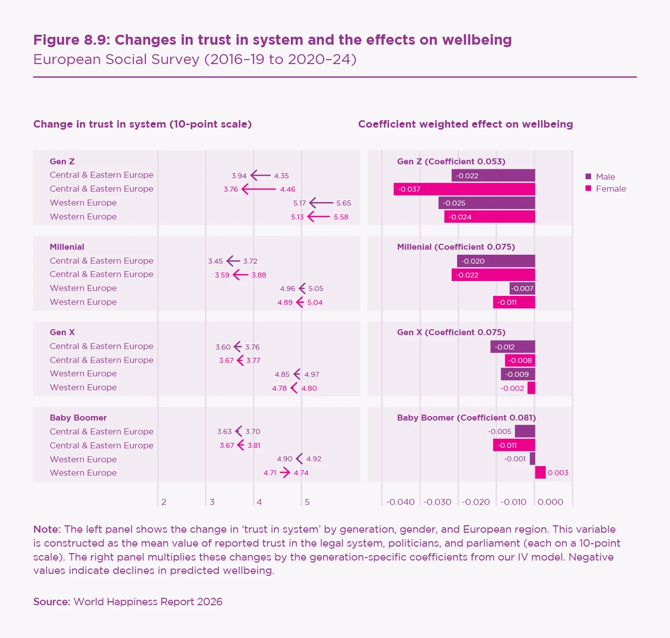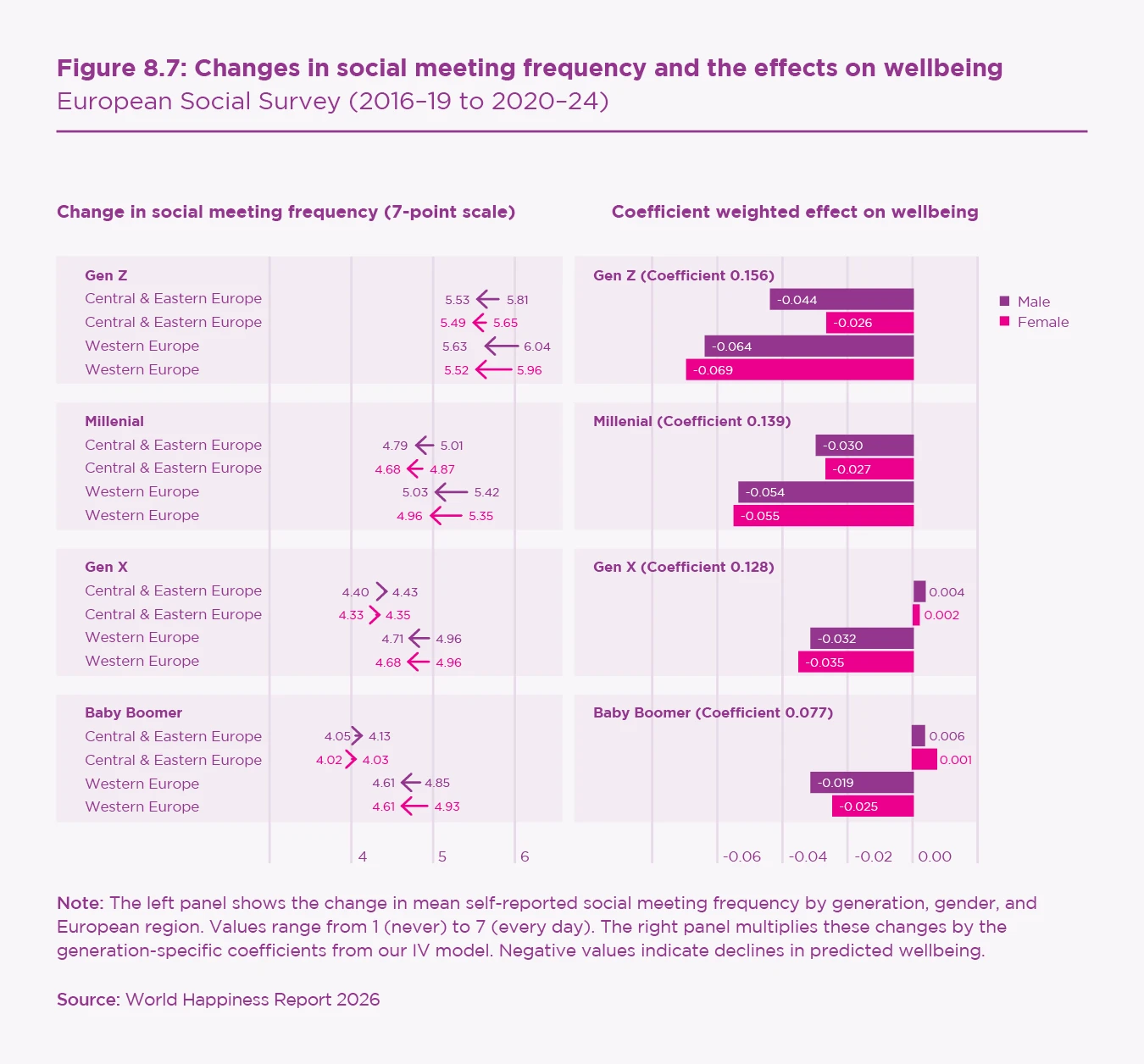 The social and emotional foundations of wellbeing have deteriorated most for younger Europeans, especially in Western Europe. Declines in interpersonal trust, institutional trust, perceived social activity, and social meeting frequency are largest for Gen Z and Millennial women. In contrast, older cohorts show more resilience, supported by rising attachment to country and, in many Central and Eastern European countries, improved feelings of safety.