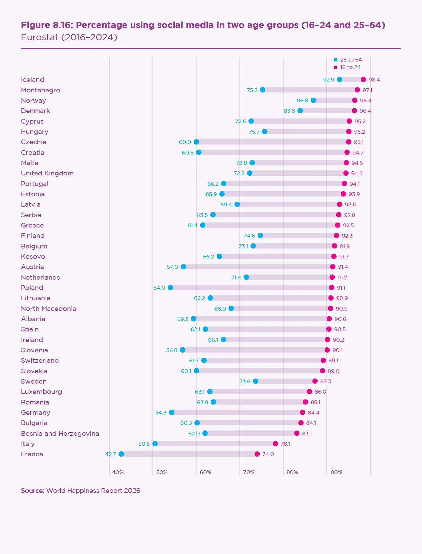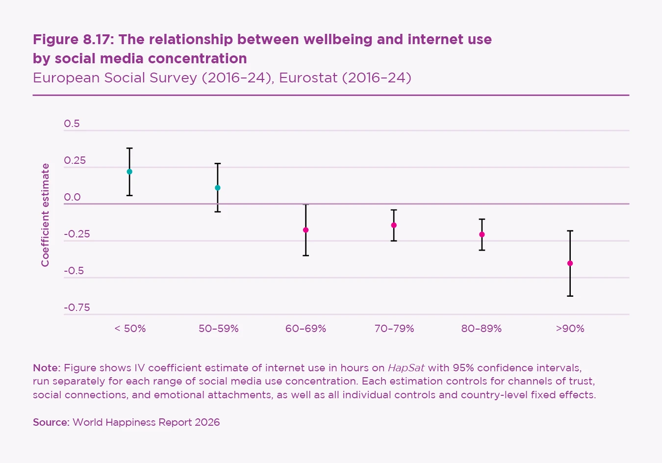 Overall, this chapter shows that the interaction between rising internet use, social media saturation, and declining social foundations has produced a distinctly generational pattern of wellbeing changes across Europe. We conclude with a discussion of our findings, their policy implications, and future research opportunities.