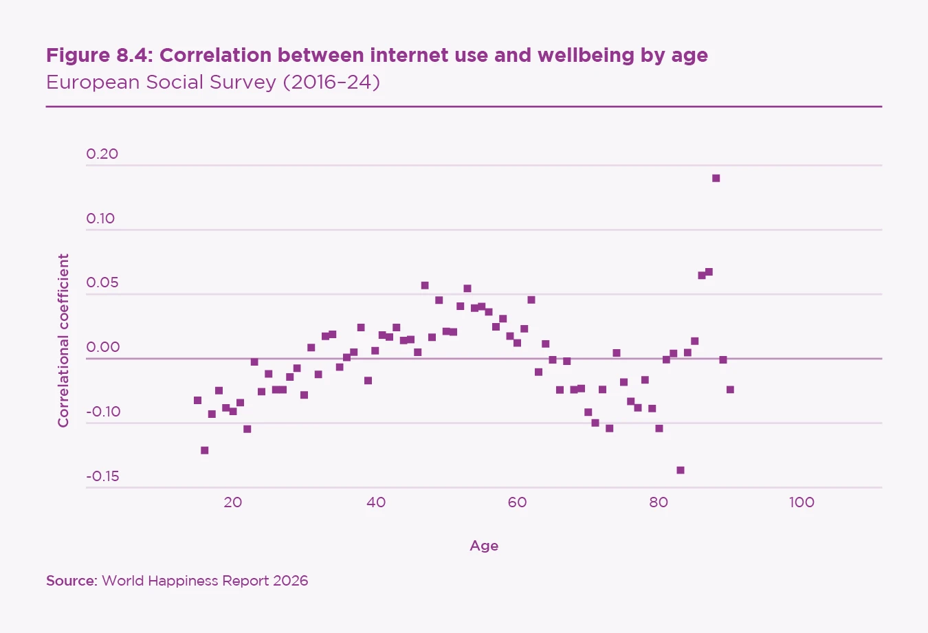To link the relationship between age and internet use to subjective wellbeing, we plot the correlation coefficients between internet use (in minutes per day) and HapSat, across age groups. Figure 8.4 suggests a quadratic, or possibly cubic, relationship, with a generally positive correlation between internet use and wellbeing for those between 35 and 60, and a generally negative relationship for those below 35 and over 60.[26]