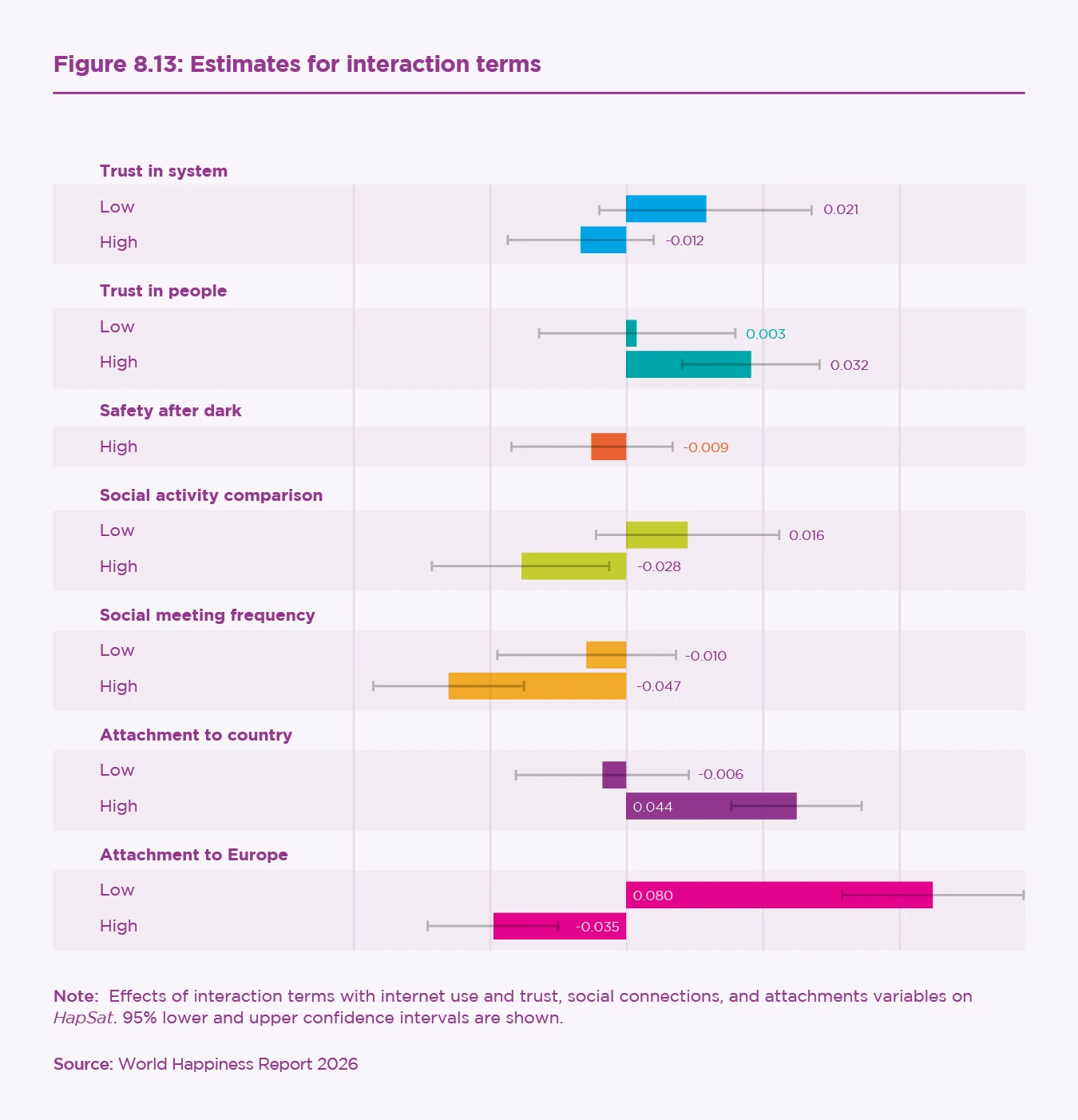 To investigate the links between trust, social connections, and wellbeing, we augment our regression analysis with a series of interaction terms to determine the differential effects of internet use on happiness for varying levels of trust and social connections across individuals. We then decompose our results across time (pre-2020 and post-2020) and geographic areas (Western vs. Central and Eastern Europe), as well as by generational cohorts (from Baby Boomers to Gen Z). To capture individuals’ digital environment, we supplement the ESS sample with Eurostat data on social media use by age, gender, and country. A central contribution of this chapter is showing that the wellbeing impact of internet use depends heavily on the level of social media saturation within an individual’s demographic peer group.