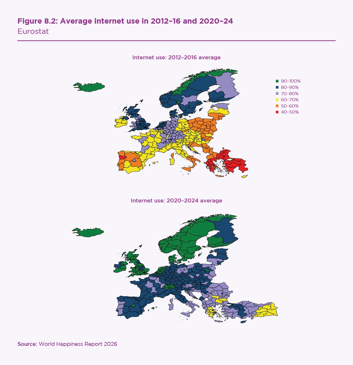 The ESS asks respondents about their daily use of the internet in minutes.[23] Furthermore, we add data from Eurostat on average internet use across the 30 countries covered by our ESS data, to compare individuals’ level of internet use relative to others in their respective regions. Figure 8.2 depicts the prevalence of internet use among residents of each NUTS2 region across Europe, in percentage terms, comparing the average level of coverage from 2012–16 to 2020–24.[24] This visual representation conveys the sizeable and ubiquitous growth in internet use over the time span, with initial levels for many regions reflecting less than 70% adoption in the early 2010s, contrasted with the preponderance of regions attaining levels above 70% by the early part of the following decade, with the majority of regions obtaining at least 80% internet use among their residents.