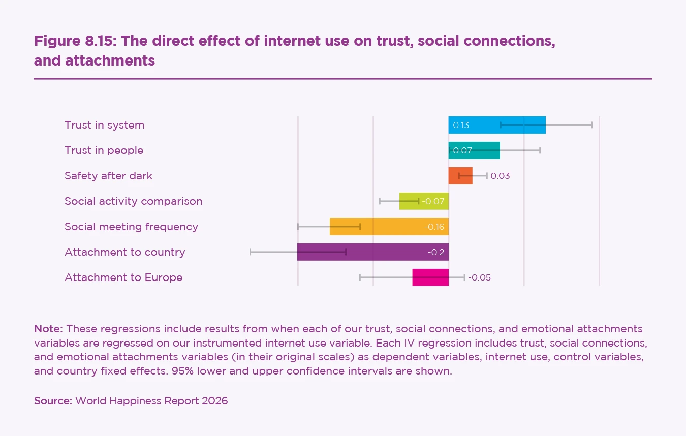 Previous studies from the World Happiness Report highlight the importance of trust and social connections for wellbeing. This chapter explores how the rise of internet and social media use has affected wellbeing directly, and also indirectly by altering trust, social connections, and emotional bonds.