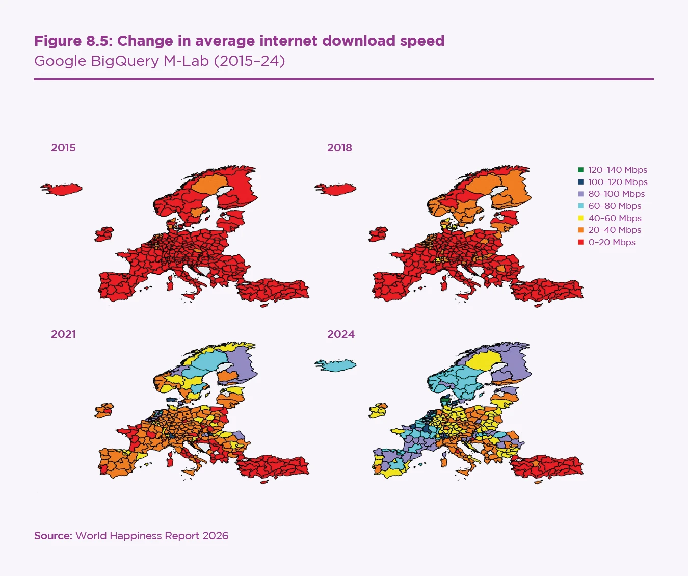 Figure 8.5 shows changes in average download speeds across NUTS2 regions from 2015 to 2024. We see that while internet speeds rose everywhere, there is significant variation in the levels and rates of growth across countries. For example, countries like Iceland, Norway, and Sweden, as well as regions in France and Germany, experienced the most drastic improvements, while regions of Southern and Eastern Europe tend to lag further behind. We exploit this variation across regions and time to instrument for internet use, under the assumption that internet infrastructure development is not a function of self-reported wellbeing of residents in that area.