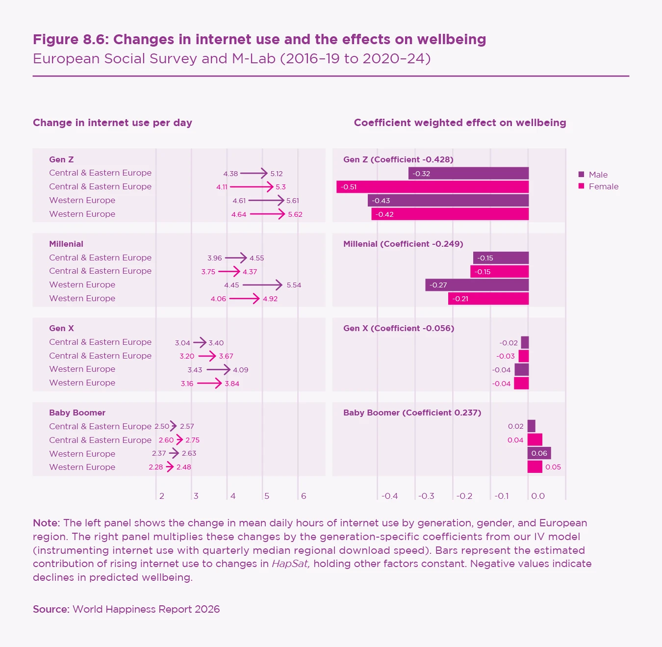 The estimated relationship between internet use and wellbeing varies sharply across generations, genders, and regions. It is strongly negative for Gen Z, moderately negative for Millennials, near zero for Gen X, and slightly positive for Baby Boomers. The generational gradient reflects both greater increases in internet use among younger cohorts (exposure) and more negative estimated coefficients for those same cohorts (susceptibility).