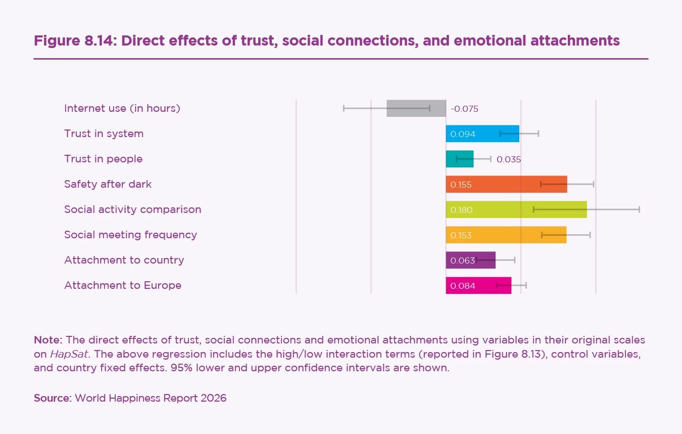 Internet use is associated with several drivers of wellbeing, including trust, perceived social activity, and social connection. Interaction terms reveal that internet use can be positive for individuals with high interpersonal trust or strong attachments to their countries. However, those who report being highly socially active experience more negative effects, consistent with substitution or displacement of offline connections.