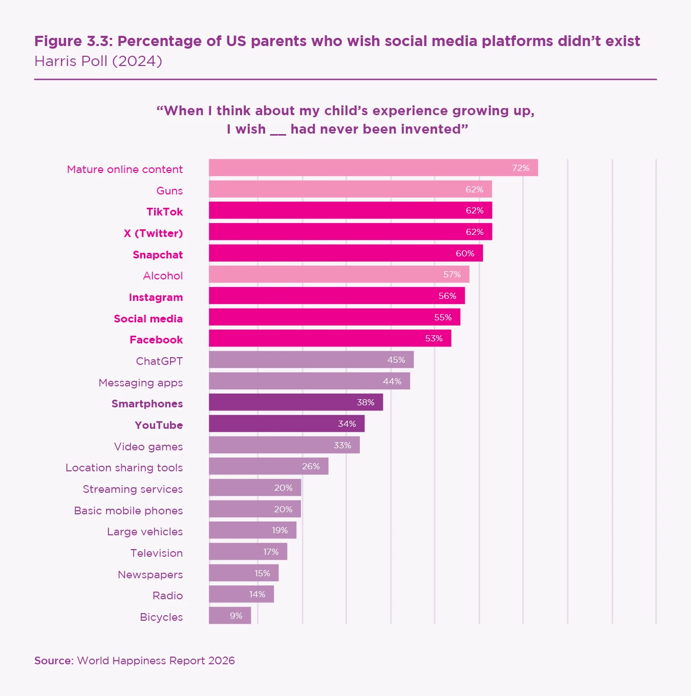 For some items, like smartphones and YouTube, there was ambivalence: about one-third of parents said they wished these had never been invented, but the majority did not. But for social media platforms, especially Facebook, Instagram, TikTok, and X, the results were far more stark. A majority of parents said they wished social media had never been created. For TikTok and X, 62% of parents expressed regret – higher than for alcohol and equal to guns.