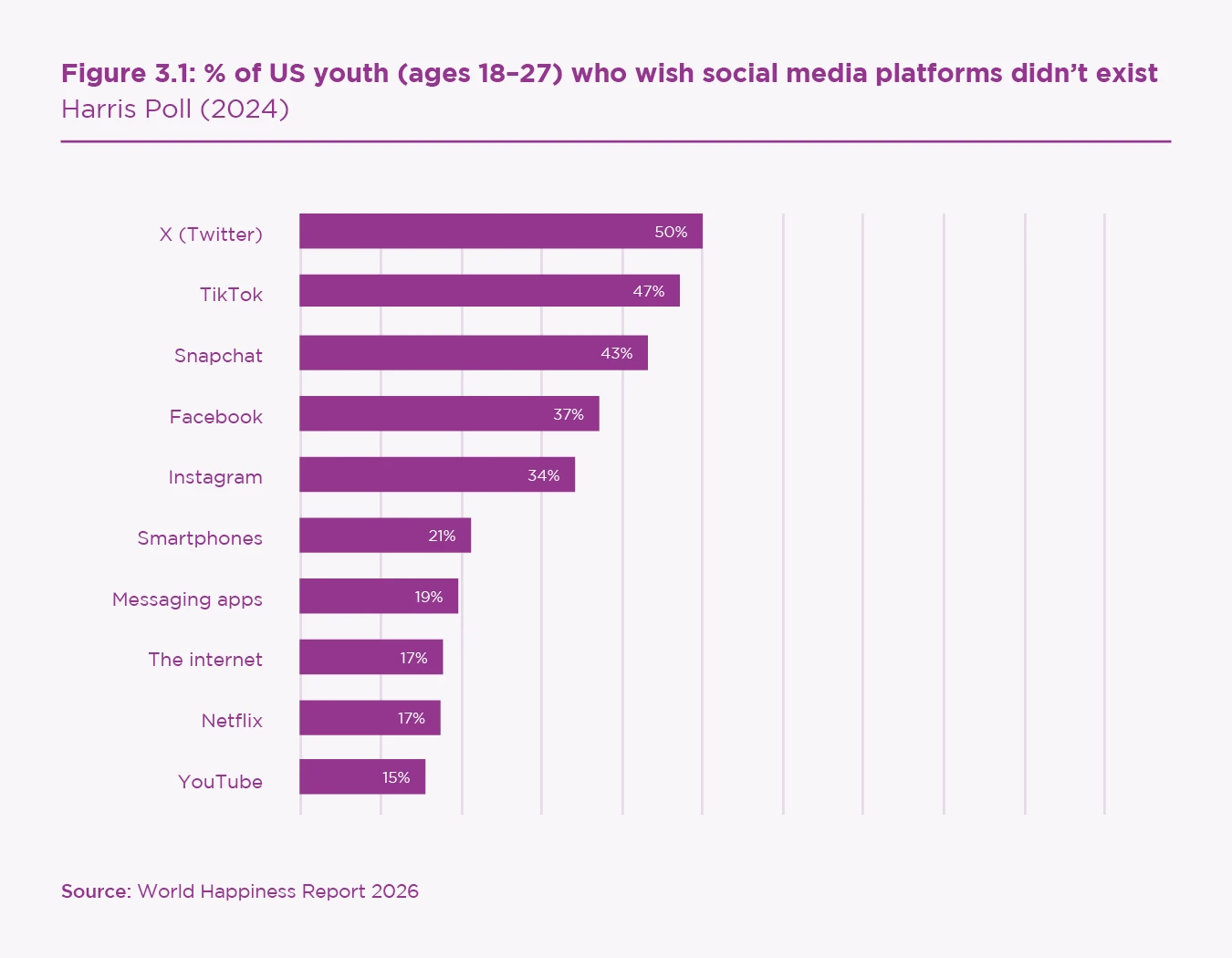A more revealing test is to ask young people whether, in retrospect, they wish these products had never been invented. In a US survey of Gen Z adults (ages 18 to 27), that we conducted with the Harris Poll,[21] regret was low for products such as YouTube (15%), Netflix (17%), and messaging apps (19%), but much higher for social media platforms: 34% wished Instagram had never been created, 43% said the same about Snapchat, and nearly half expressed regret about TikTok (47%) and X (50%). In other words, one-third to one-half of young adults wish that some of the platforms they use for five or more hours each day had never existed.[22]