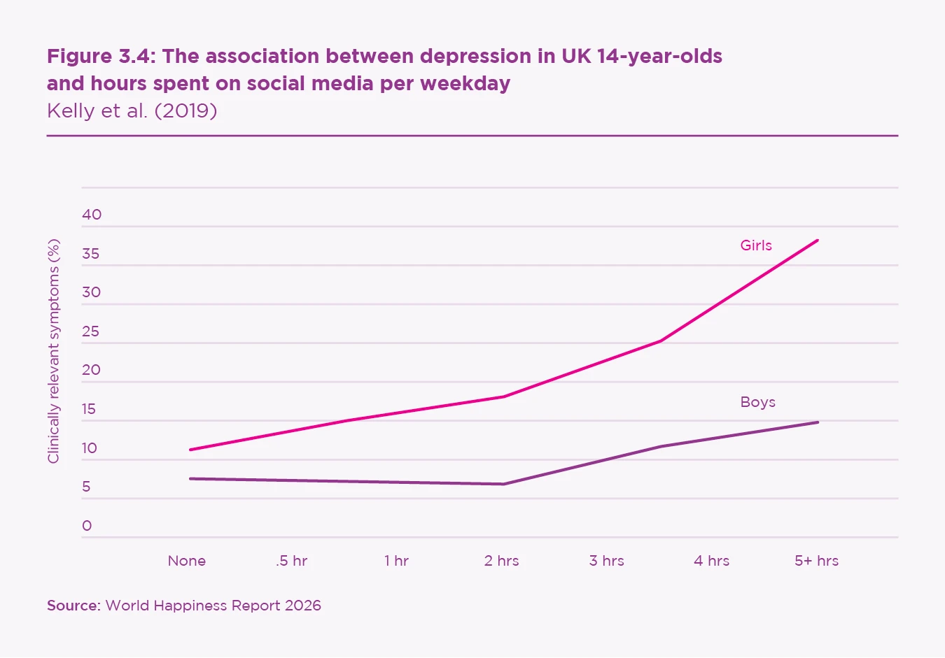 Twenge, J. (2026). Adolescent life satisfaction and social media use: gender differences in an international dataset. In World Happiness Report 2026 (Chapter 3). University of Oxford: Wellbeing Research Centre.