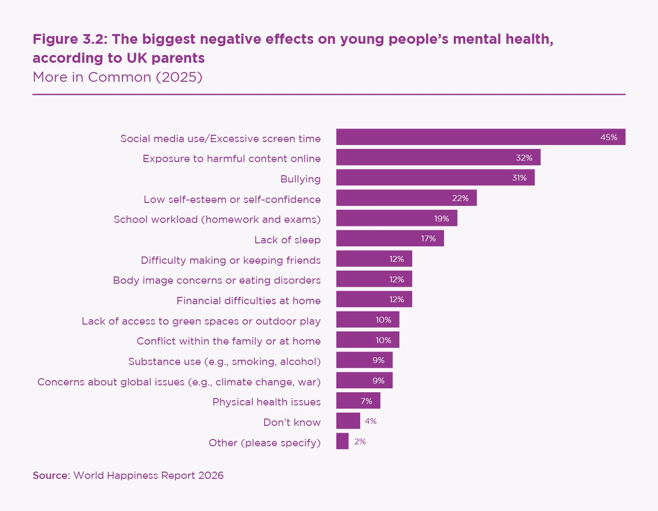A 2025 Pew survey of US teens and their parents found that 44% of parents identified social media as the single most negative influence on teen mental health, ahead of “technology generally”.[36] Similarly, the 2025 UK survey by More in Common (discussed in Exhibit A) asked parents to identify what most negatively affects their own children’s mental health. The top response was “social media use/excessive screen time”, followed by concerns closely linked to digital technology, including exposure to harmful online content, bullying, low self-esteem, and lack of sleep (see Figure 3.2 below).
