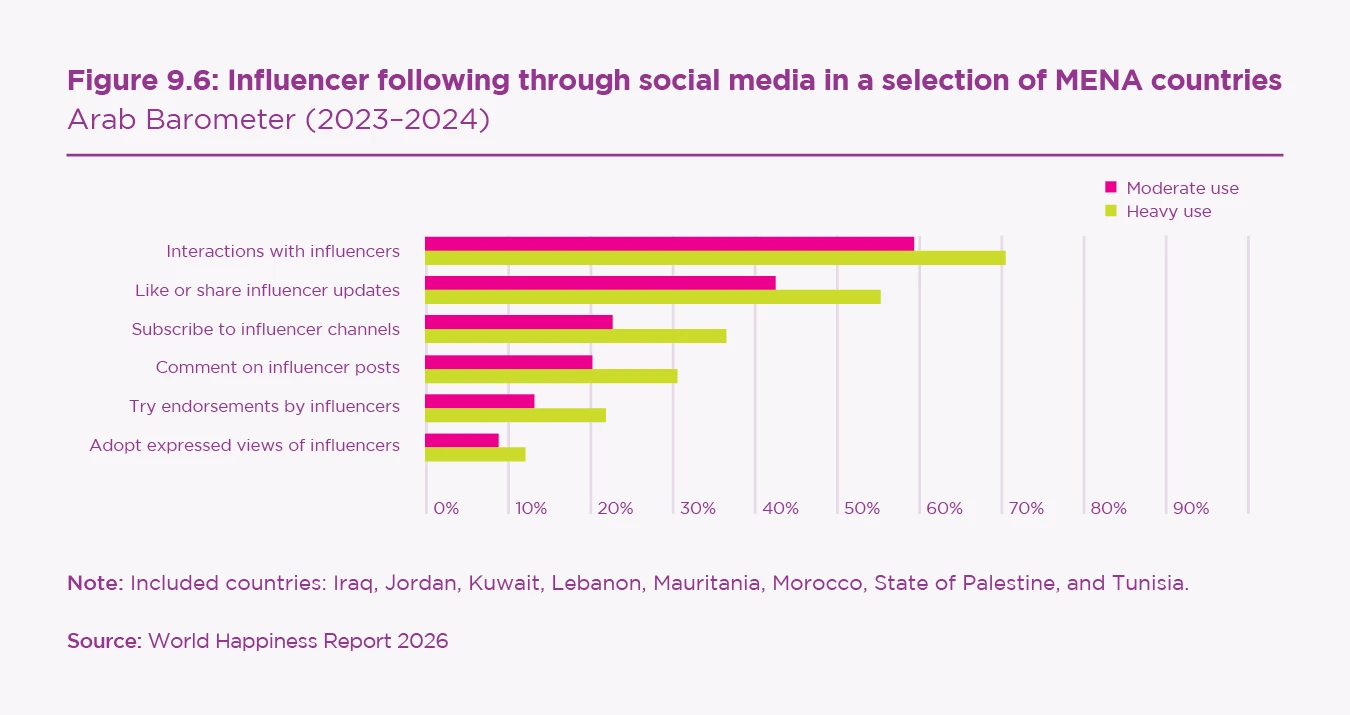Social media influencers are highly popular in the MENA region. According to the 2023–2024 Arab Barometer, 63% of social media users report having interactions with influencers (see Figure 9.6),[20] where heavy users are more likely to follow influencers than moderate users. The most common topics include sports and recreation (17%), beauty and fashion (16%), arts and culture (14%), food and cooking (12%), and politics and reform (10%). While most users primarily watch or like influencer content, a substantial share engages more actively: of the heavy users, 31% comment or ask questions and 22% report trying products or services recommended by influencers.