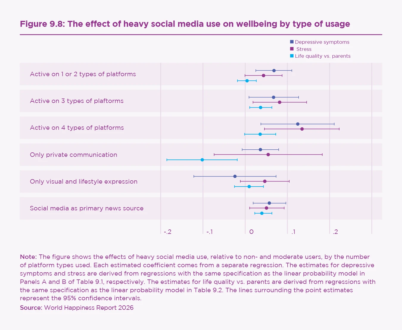 The type of heavy use also matters. Multiple-platform use, following influencers, and relying on social media as a primary news source show the strongest associations with negative wellbeing outcomes. These forms of use are more closely linked to stress, depressive symptoms, and low evaluations of quality of life relative to one’s parents. A likely explanation is that such uses increase cognitive overload and intensify social comparison and public visibility. Unfortunately, the data do not allow us to distinguish directly between passive and active use. Nevertheless, it is plausible and shown in other studies that when social media is primarily[50] used to maintain existing offline social relationships, its effects are largely positive.[51]