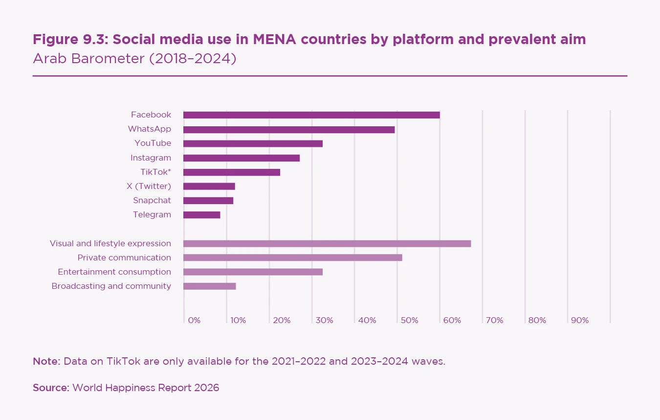 We document that the relationship between social media use and wellbeing in the MENA region is not uniformly positive or negative, but rather depends on how platforms are used and the context in which digital life unfolds. The interplay between opportunities for connection and expression on the one hand, and risks associated with social pressures and exposure to harmful or restrictive content on the other, shapes the relationship between social media use and wellbeing in the region. The results suggest substantial similarities between the MENA region and Western societies.
