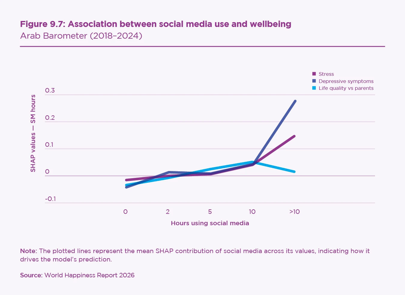 The plots indicate that the association varies across different levels of use. Across all three outcomes (stress, depressive symptoms, and relative life quality), the SHAP curves remain close to zero at lower use levels, indicating a negligible difference between non-users and moderate users. For life quality in particular, the curve already begins to trend upwards (thus lower quality of life compared to parents) after approximately three hours of daily use, while noticeable increases in predicted stress and depressive symptoms emerge among users who spend more than five hours on social media per day. In other words, wellbeing differences are modest at low and moderate exposure, but substantial declines in wellbeing emerge among heavy users. These results support our distinction between moderate and heavy users in the Arab Barometer data and align with the wider empirical literature.[39]