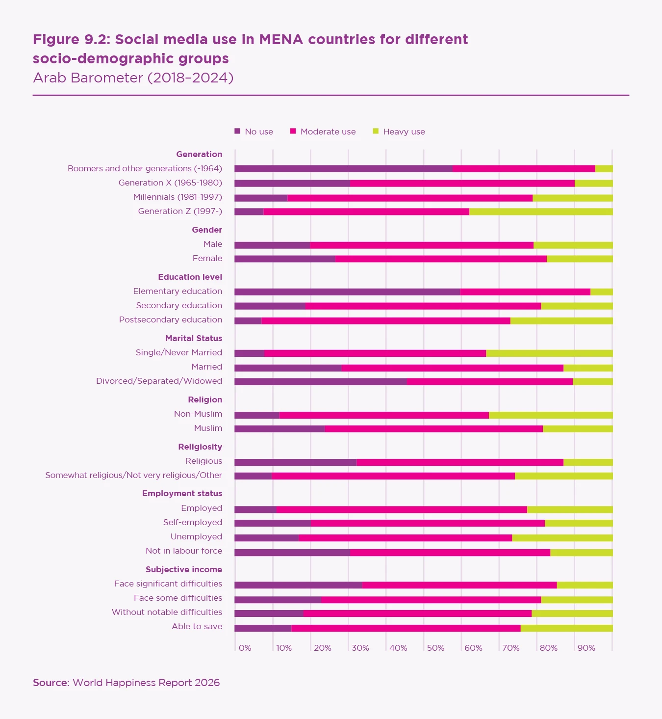 Patterns of social media use vary substantially across social groups within countries (see Figure 9.2). Non-use is particularly common among older generations, with nearly 60% reporting no social media use. Overall, social media use is more prevalent among men (80%) than women (73%), and less common among married individuals (73%) than among those who are single or have never been married (92%). Usage rates are also relatively low among more religious individuals, those with only an elementary education (40%), and people experiencing significant financial difficulties (66%). Heavy social media use (defined as more than five hours per day) is concentrated among younger cohorts. Most notably, 38% of Generation Z (born 1997–2012) report spending more than five hours per day on social media. Heavy use is also more common among non-Muslims (33%) and among individuals who are single or have never been married (34%).