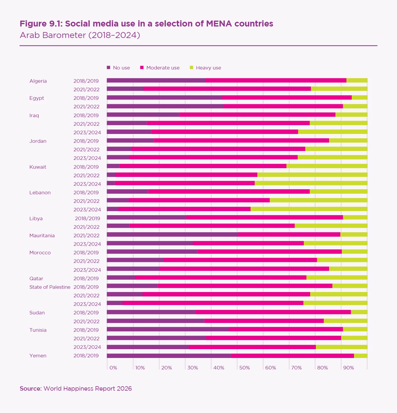 However, it is worth cautioning that most studies on the MENA region use convenience samples, which are not necessarily representative of the overall population. In the following sections, we will examine the relationship between social media use and wellbeing in the MENA region, utilising representative data from the Arab Barometer.