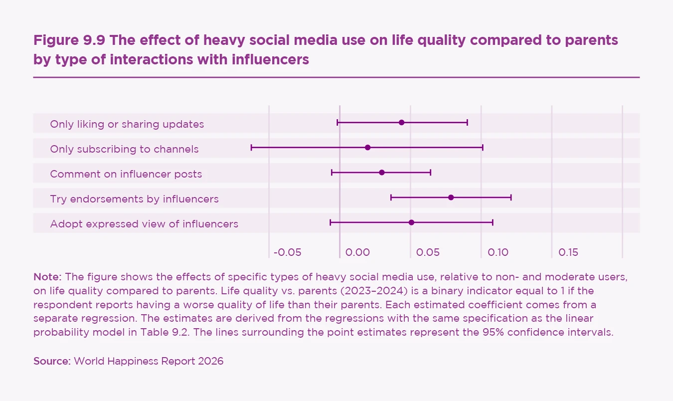 The data on quality of life compared to one’s own parents allows us to distinguish between respondents who follow influencers on social media and those who do not,[49] and to examine how this interacts with heavy social media use. The results reported in the second column of Table 9.3 show that following influencers is not significantly associated with feeling better or worse off than one’s parents among moderate social media users. However, this changes when influencer content is combined with very intensive use. Heavy users are significantly more likely to say that they are worse off than their parents if they follow influencers. In a linear probability framework, the interaction between heavy use and following influencers is positive and statistically significant, indicating that the combination of high exposure and influencer content increases the probability of feeling worse off across generations (+6 percentage points), compared with similar heavy users who do not follow influencers. In other words, it is not influencers specifically, but heavy engagement with influencers’ feeds that is associated with a more pessimistic view of life compared to one’s own parents.