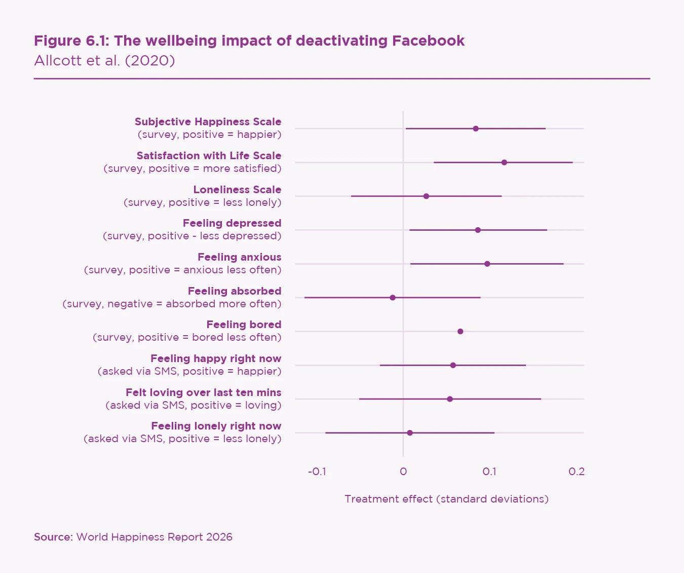 The experiment in the previous section focused only on WTP and WTA; it did not investigate the effects of social media platforms on subjective experience. Hunt Allcott and collaborators sought to do that and, hence, to answer the question posed above.[11] They used a randomised experiment, designed to cast light on the consequences of social media use for people’s enjoyment of their lives. They recruited a sample of 2,743 Facebook users and elicited their WTA to deactivate for a month (interestingly, they did not ask for WTP). The median WTA was $100, and 61% of subjects had a WTA under $102. Of those, half were randomly assigned to a treatment group which was paid to deactivate for four weeks, and half were randomly assigned to a control group that stayed on the platform during that time. A central question was the effect of deactivation on subjective wellbeing.