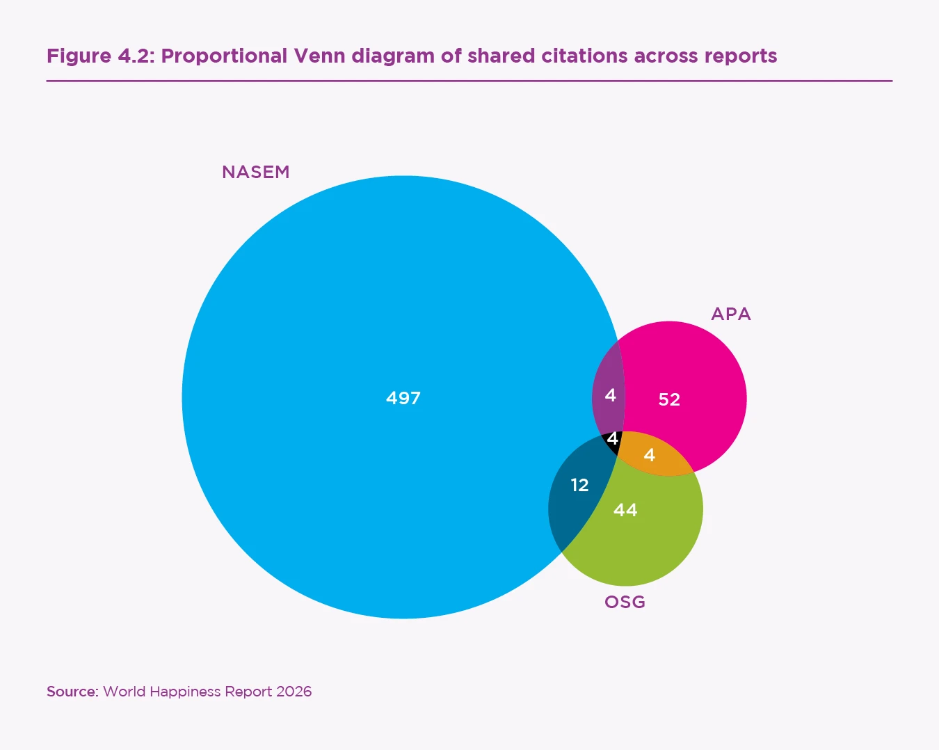 Despite organisations’ broadly similar scientific evidence characteristics, analysis of citation overlap revealed very few shared pieces of literature. Of the 668 total cited journal articles, there were 617 unique works, with 24 articles present in multiple sources. Only four citations appeared across all three documents, representing less than 1% of the total unique academic literature.[65] Pairwise overlaps reveal a further 20 articles found in two of the three reports. Figure 4.2 visualises these shared citation patterns. Online Appendix 4C contains the information of the overlapping articles.
