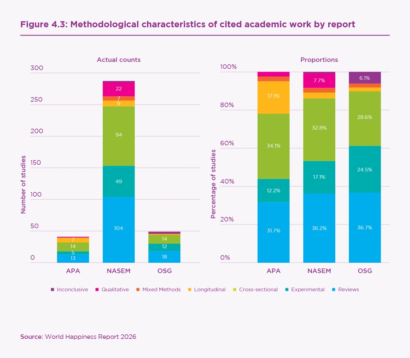 To understand the types of research organisations selected, we systematically categorised all 617 unique peer-reviewed articles. Our analysis focused on the 355 articles whose primary topic was social media and adolescent health, which comprised 53% of the APA reports’ journal articles, 55% of the NASEM report’s, and 77% of the OSG report’s.[66] The academic literature cited across all organisations showed similar methodological distributions. The most frequently cited study types were meta-analyses or systematic reviews (35.8%, k = 127), cross-sectional studies (31.3%, k = 111), experimental studies (17.5%, k = 62), ethnographic or qualitative studies (6.5%, k = 23), and longitudinal designs (4.8%, k = 23). Notably, only 16.6% (k = 59) of cited articles employed methodologies that could plausibly support causal inferences.[67] Table 4.3 shows methodological characteristics by report.[68]